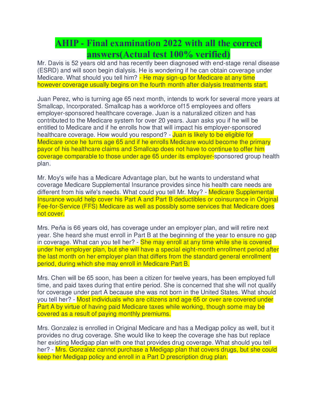 AHIP - Final examination 2022 with all the correct answers(Actual test 100% verified) Mr. Davis is 52 years old and has recently been diagnosed with end-stage renal disease (ESRD) and will soon begin...