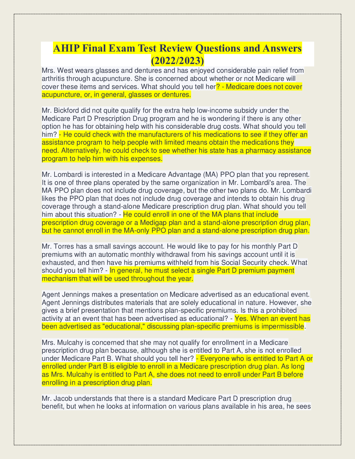 AHIP Final Exam Test Review Questions and Answers (2022/2023) MR CHEN AHIP STUDY GUIDE 2022 MS ,MOORE AHIP Final Exam Test Review Questions and Answers 2022- 2023 (MR WEST) AHIP - Final exami... nation 2022 with all the correct answers(Actual test 100% verified)(mr davis) [Show More]