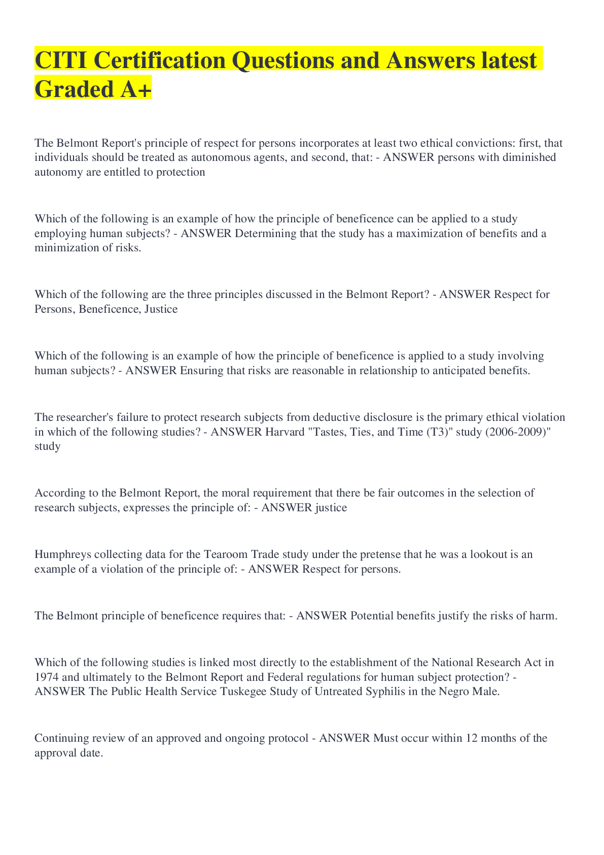 Social Sciences> QUESTIONS & ANSWERS > CITI Certification Questions and Answers 100% Solved (All)