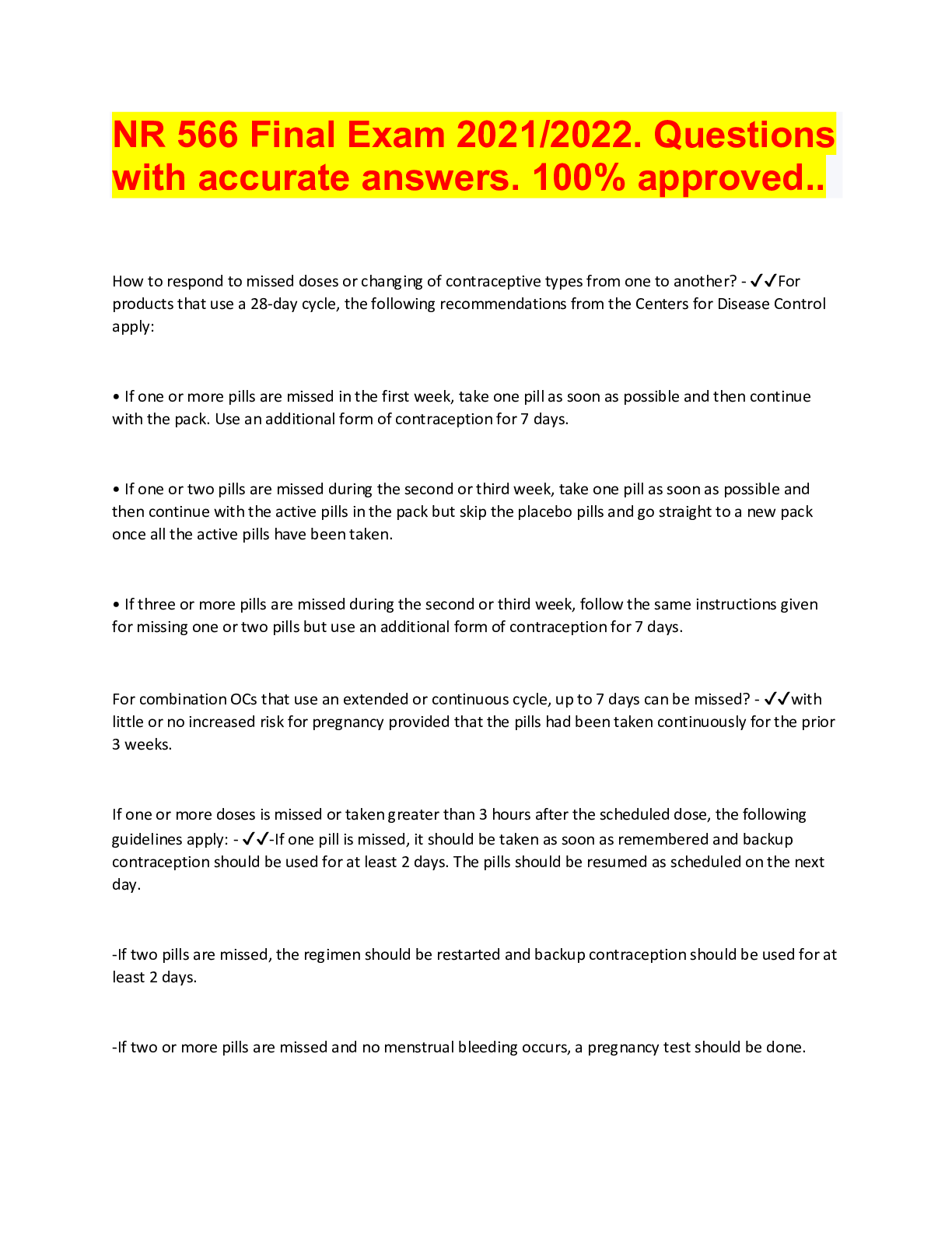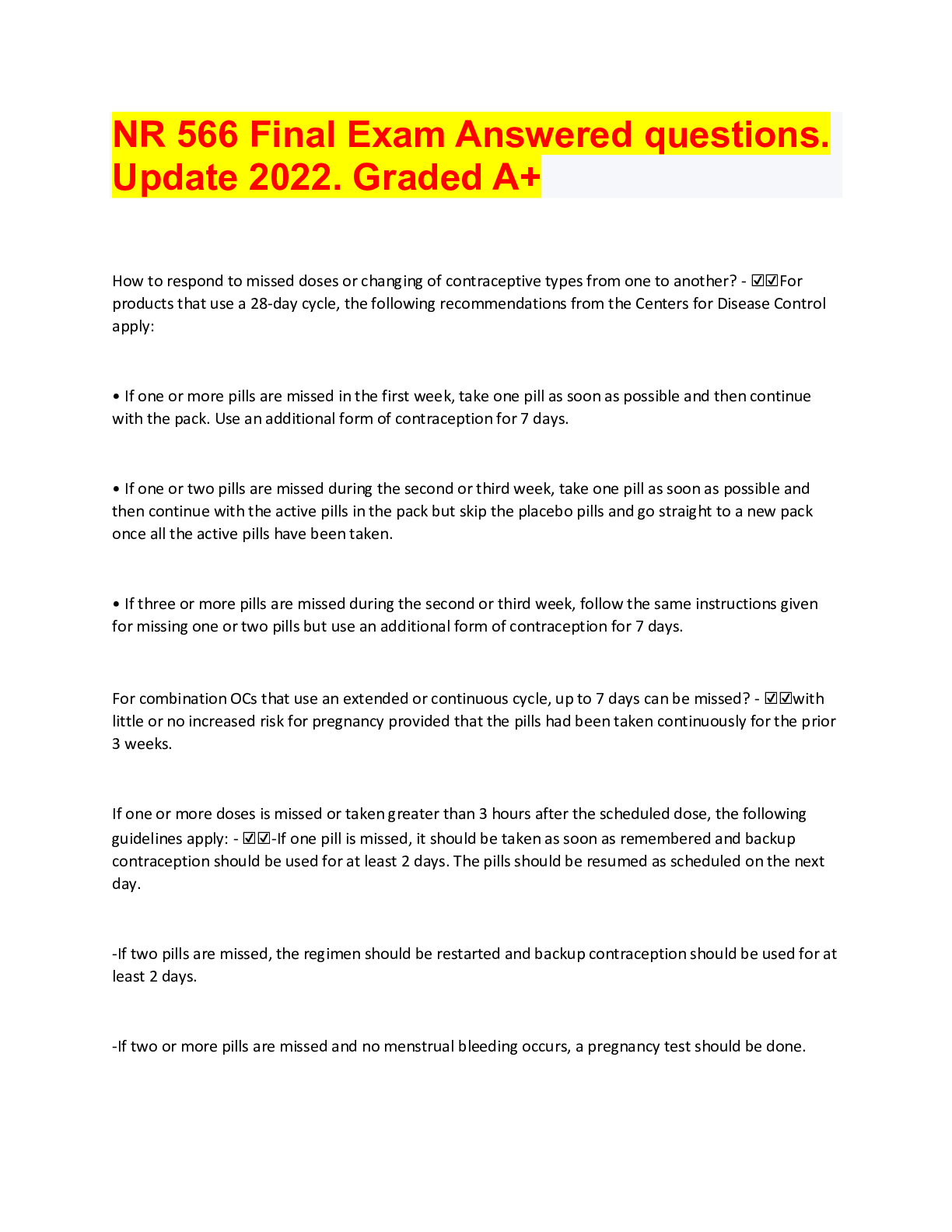 NR 566 Final Exam Answered questions. Update 2022. Graded A+ How to respond to missed doses or changing of contraceptive types from one to another? - ☑☑For products that use a 28-day cycle, the f...