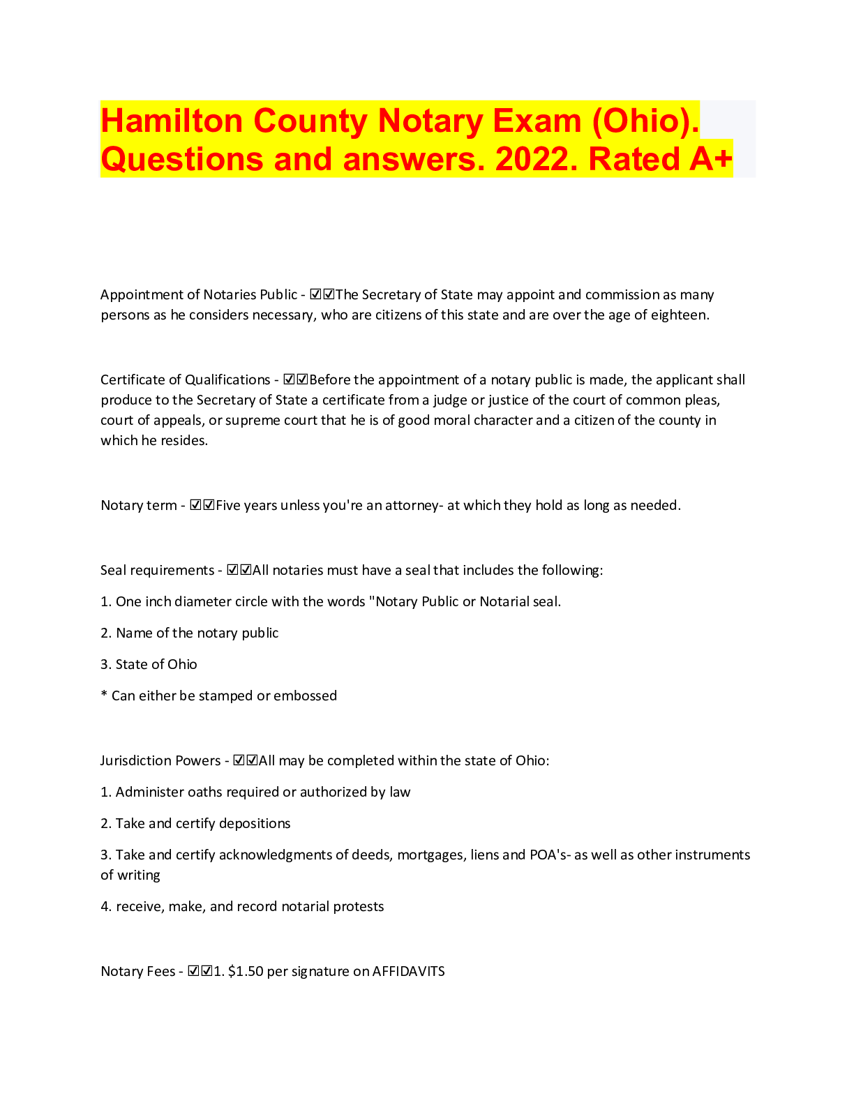 Law> QUESTIONS & ANSWERS > Hamilton County Notary Exam (Ohio). Questions and answers. 2022. Rated A+ (All)