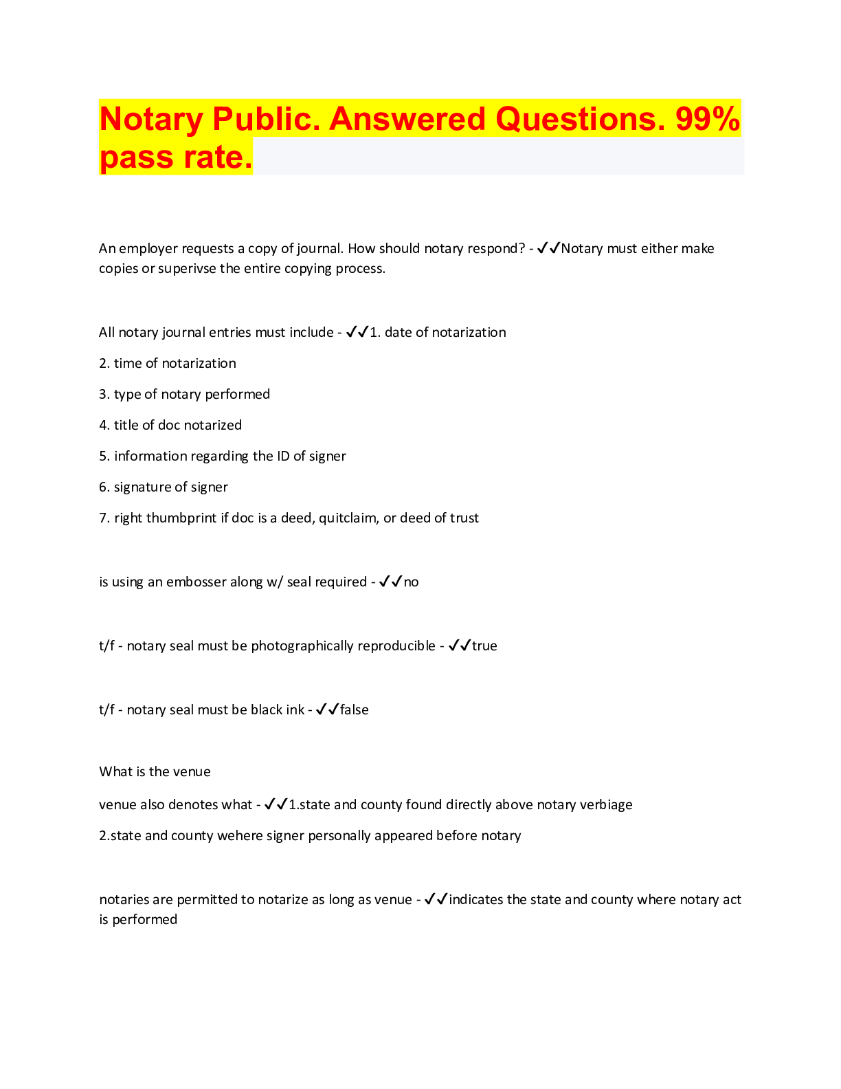 Law> QUESTIONS & ANSWERS > Notary Public. Answered Questions. 99% pass rate (All)