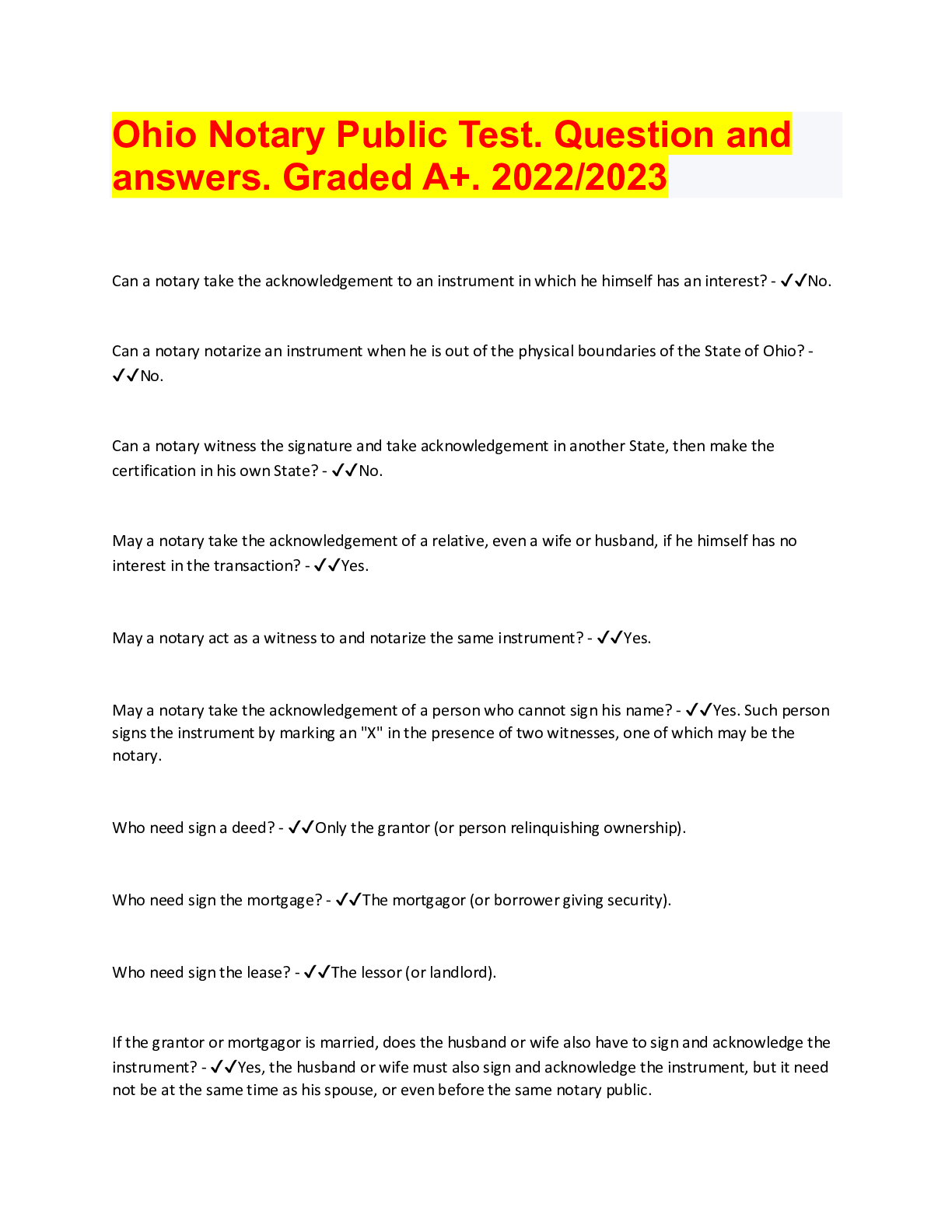 Ohio Notary Public Test. Question and answers. Graded A+. 2022/2023