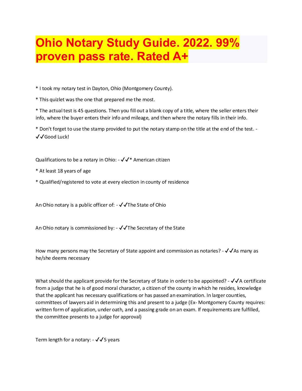 Law> STUDY GUIDE > Ohio Notary Study Guide. 2022. 99% proven pass rate. Rated A+ (All)