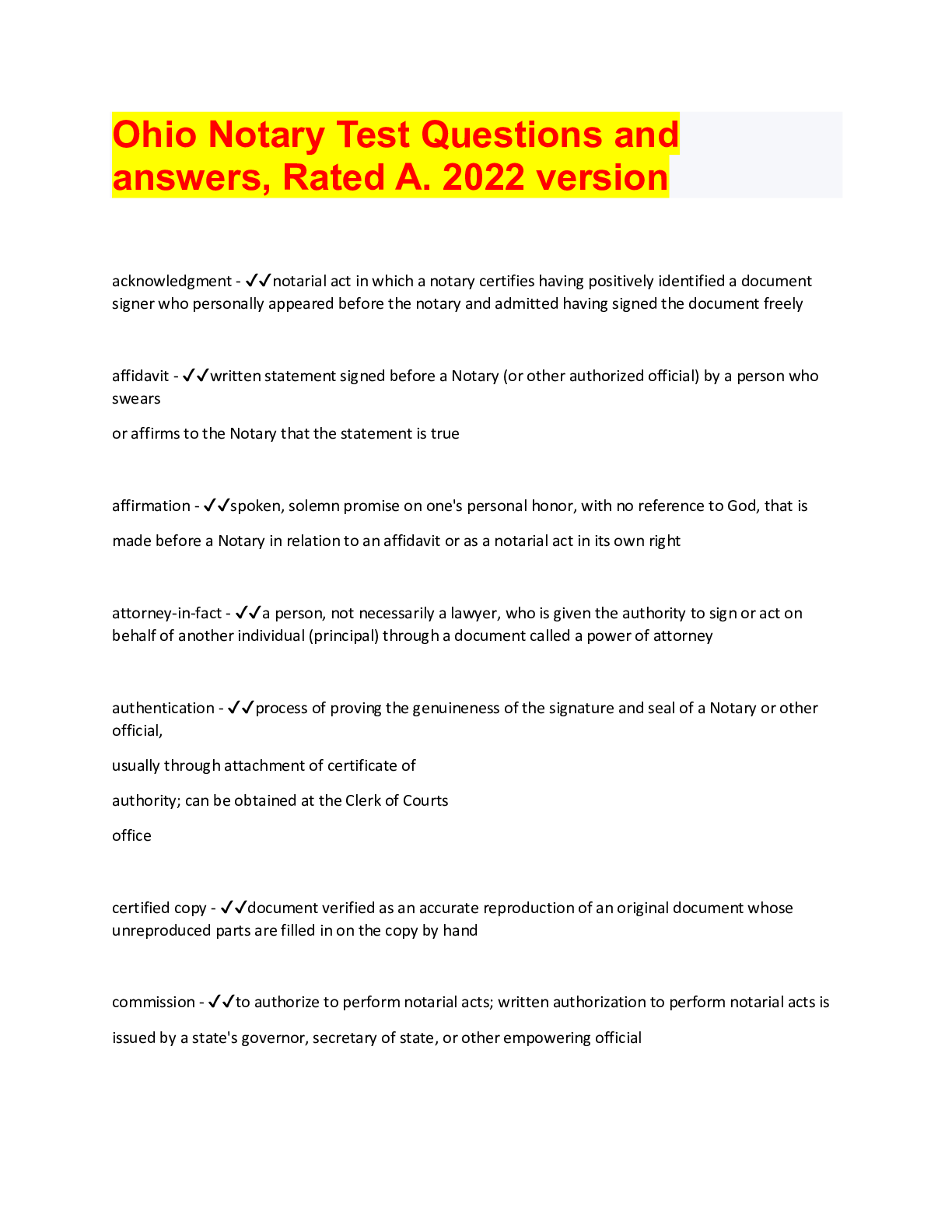 Law> QUESTIONS & ANSWERS > Ohio Notary Test Questions and answers, Rated A. 2022 version (All)