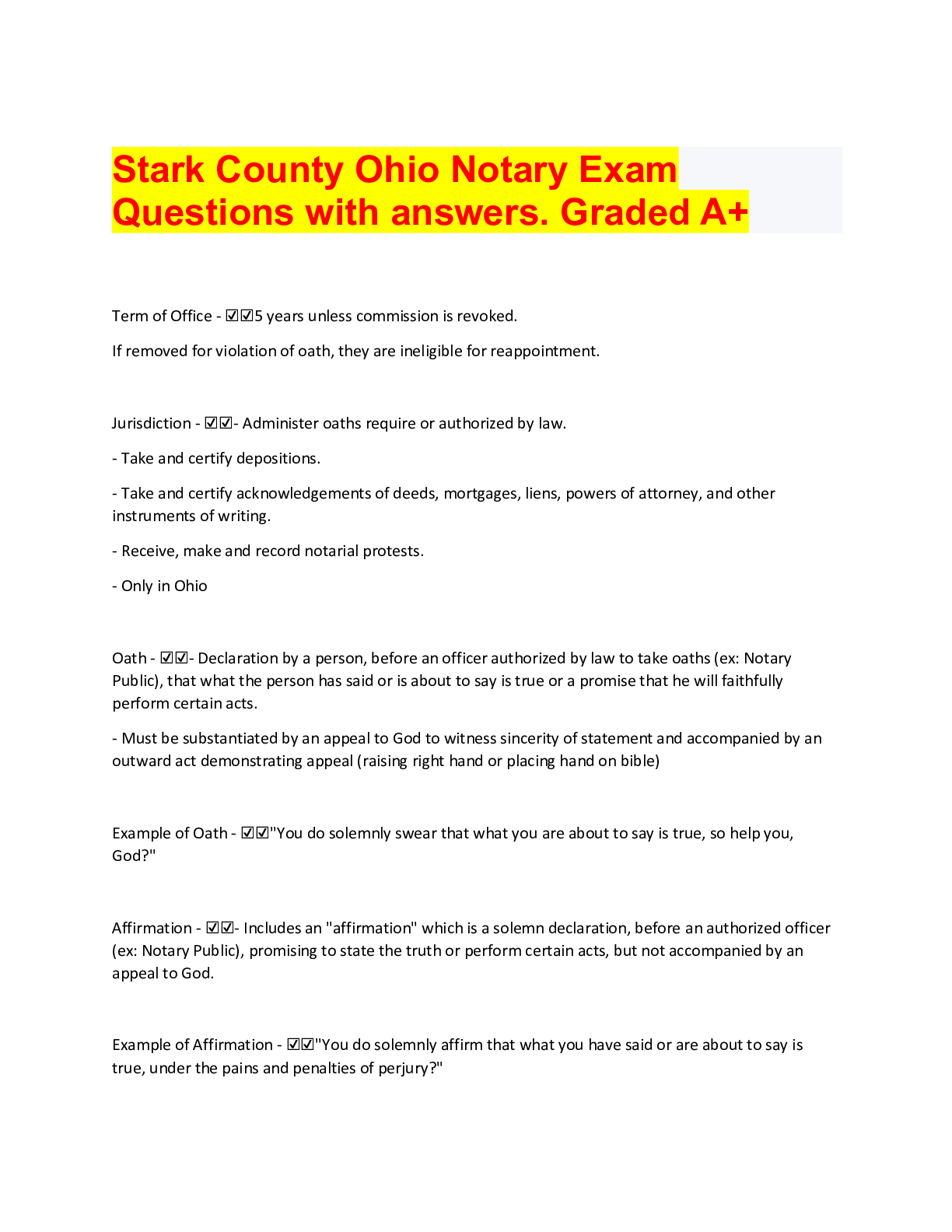 Law> QUESTIONS & ANSWERS > Stark County Ohio Notary Exam Questions with answers. Graded A+ (All)