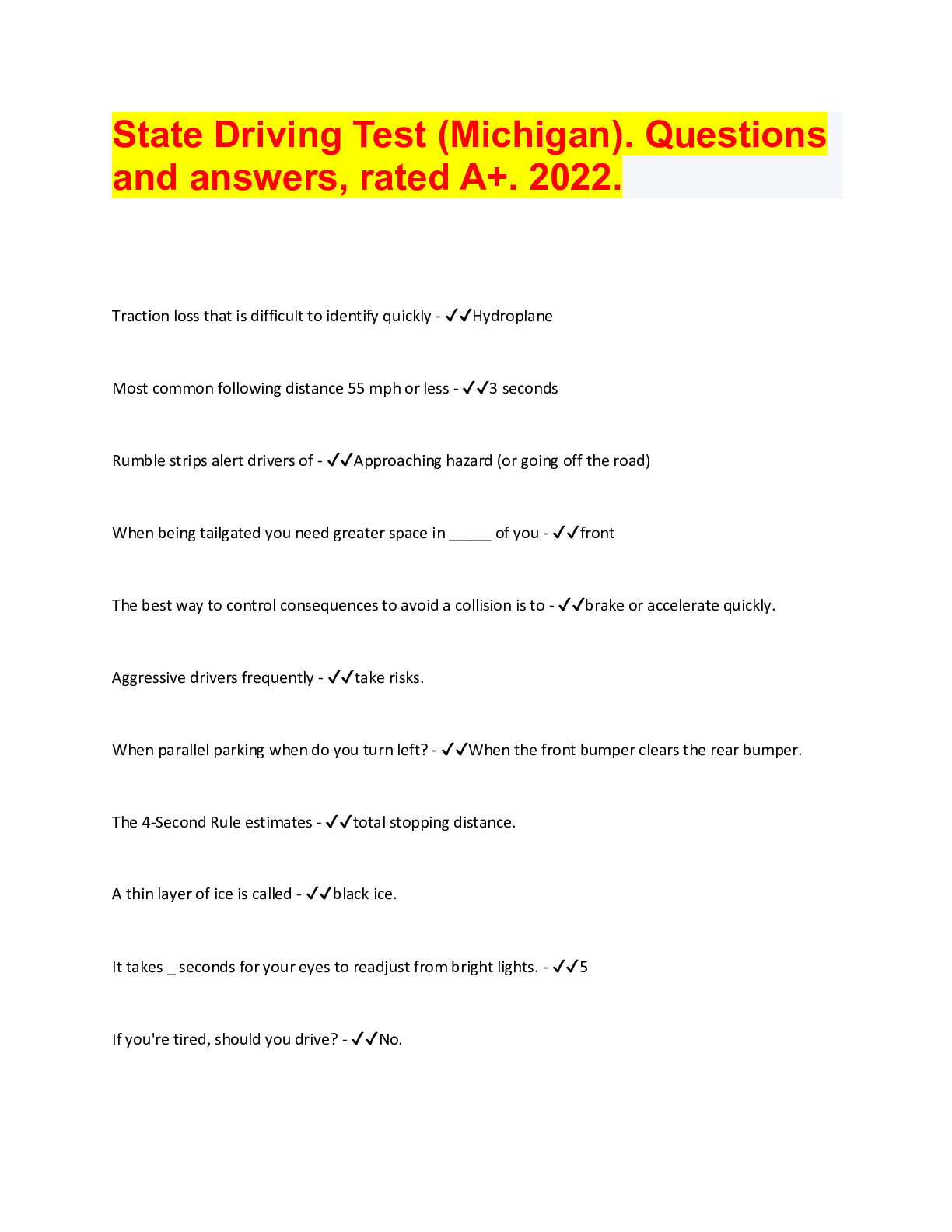 Driving Course> QUESTIONS & ANSWERS > Michigan Permit Practice Test Questions and answers, 2022. 100% pass rate. (All)