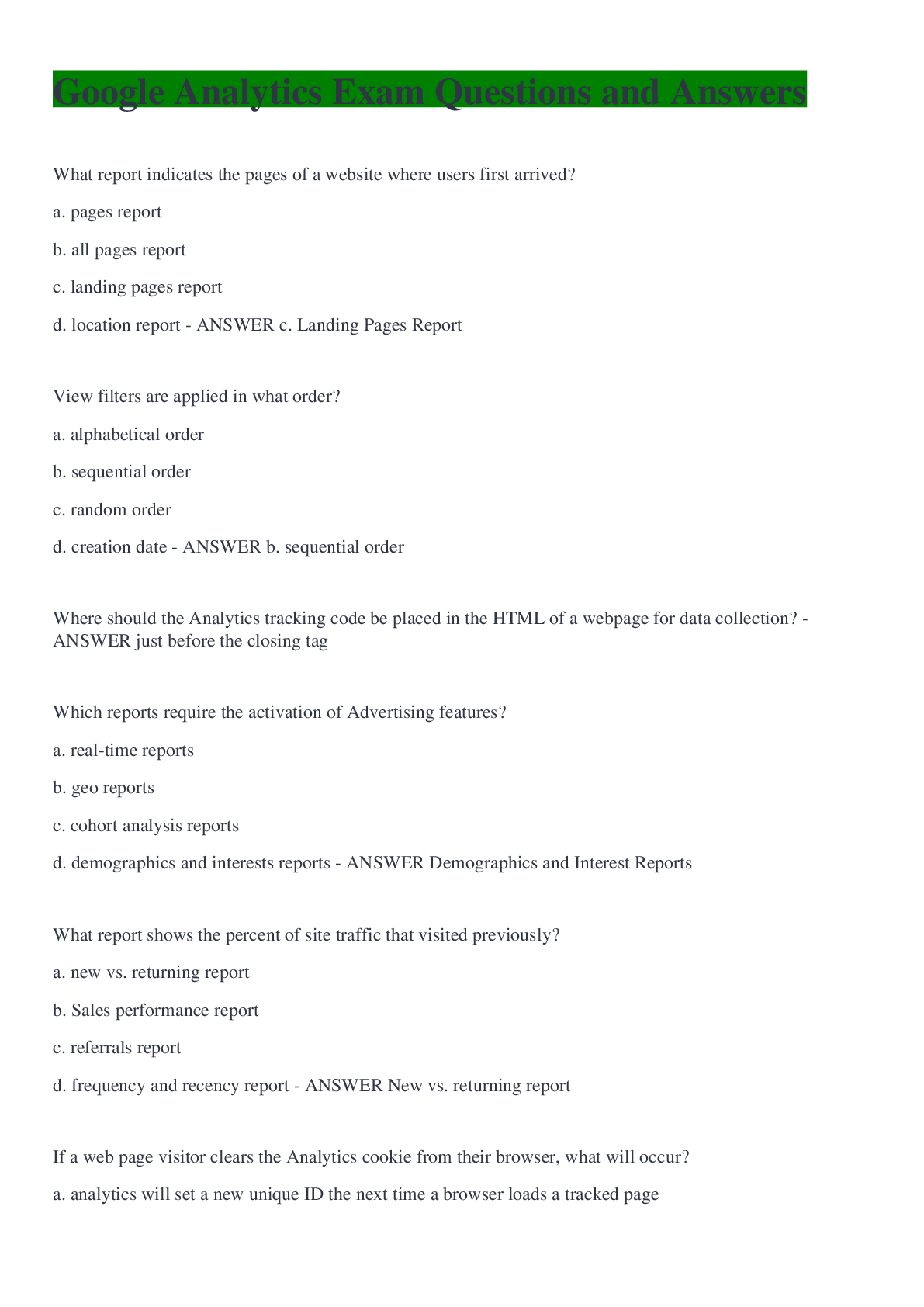 Google Analytics Certification Exam Questions and Answers Google Analytics IQ Exam with correct Answers Google Analytics Demo Questions and Answers Google Analytics Exam Questions and Answers Go... ogle Analytics Exam with100%correct Answers Google Analytics Certification Exam Questions and Answers Google Analytics Exam with complete solutions Google Analytics Exam Questions and Answers Google Analytics Individual Qualification Exam Questions and Answers Google Analytics Certification Exam Questions And answers With Complete solution [Show More]