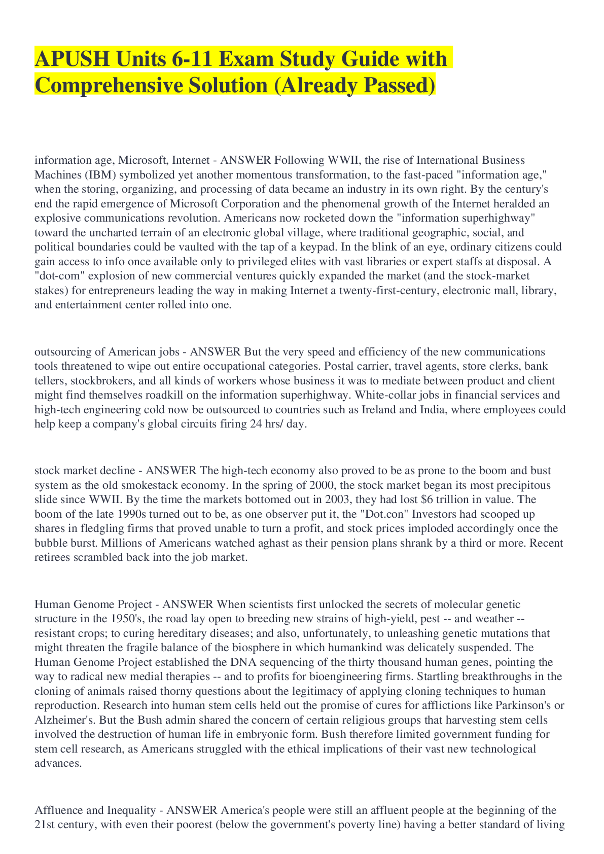 APUSH Unit 1Exam 2022/2023 answered 100% correct APUSH Units 1-3 Exam APUSH Units 6-11 Exam Study Guide with Comprehensive Solution (Already Passed)... [Show More]