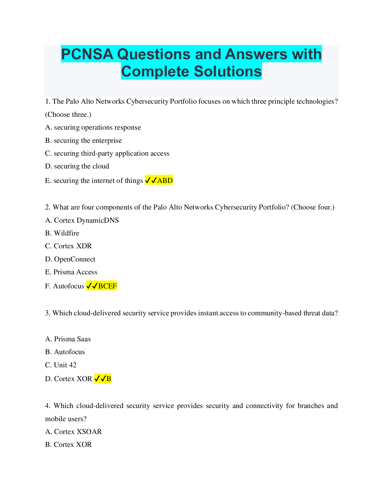 PCNSA Questions and Answers with Complete Solutions 1. The Palo Alto Networks Cybersecurity Portfolio focuses on which three principle technologies? (Choose three.) A. securing operations response...