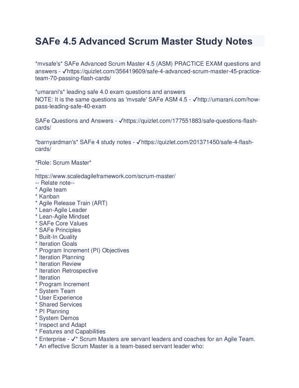 SAFe 4.5 Advanced Scrum Master Study Notes Latest Update With Complete Solution / Rated A