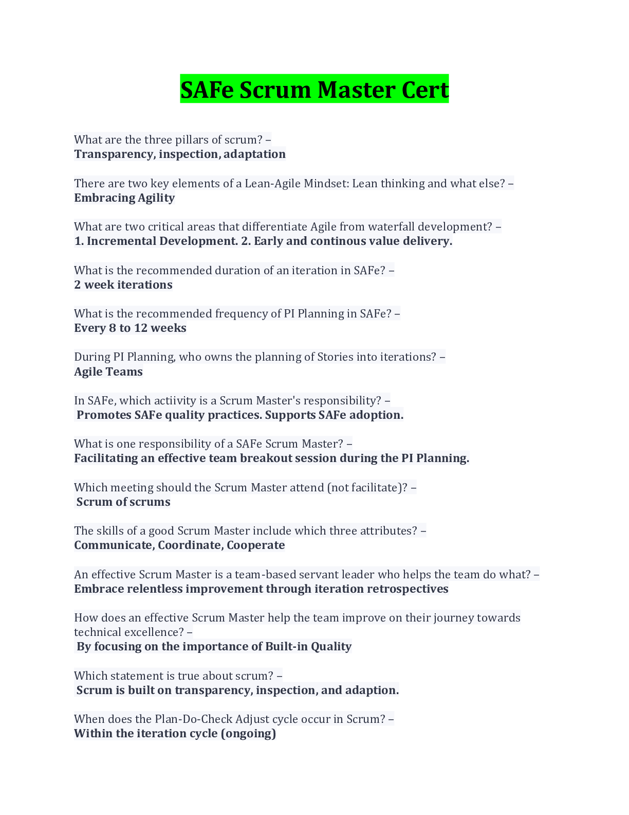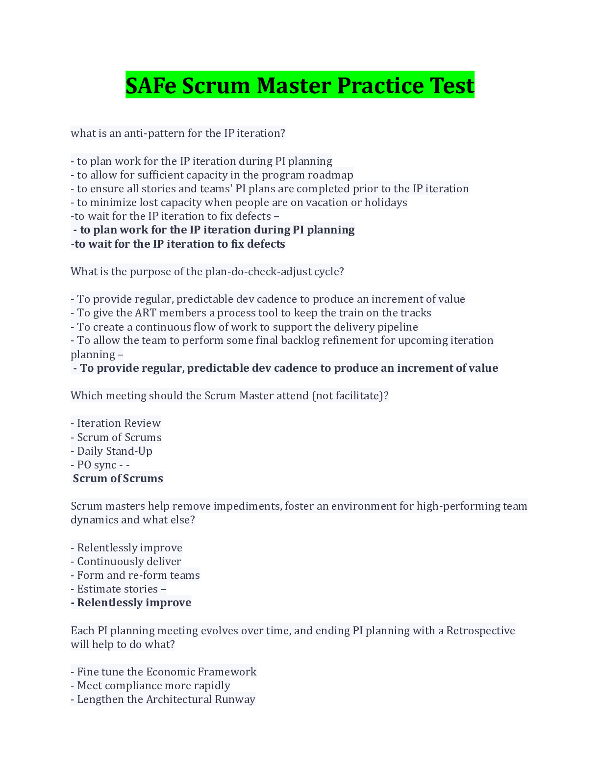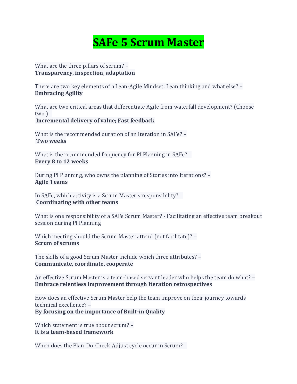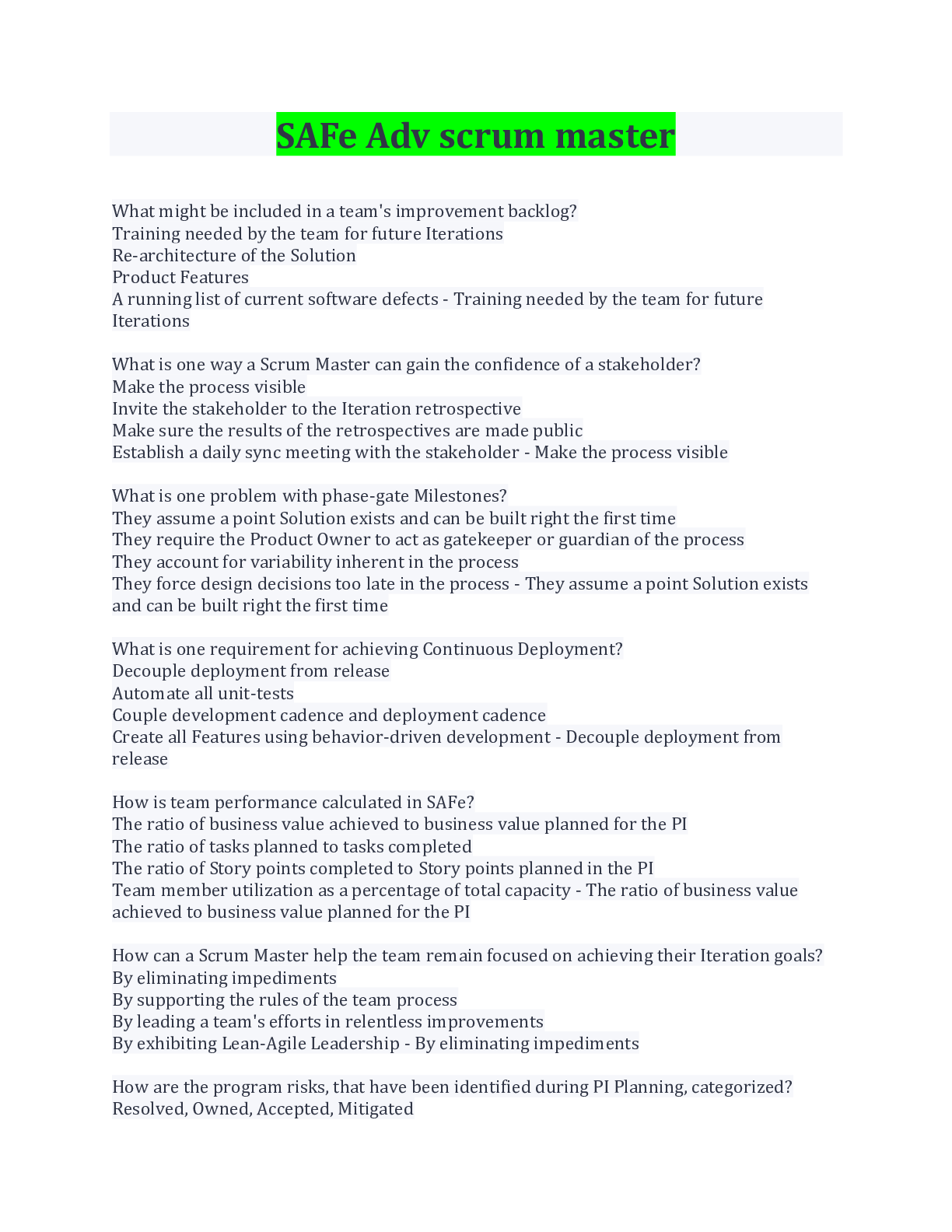 SAFe Scrum Master Practice Test Latest Update Questions And Answers Latest Update With Complete Solution . DOWNLOAD