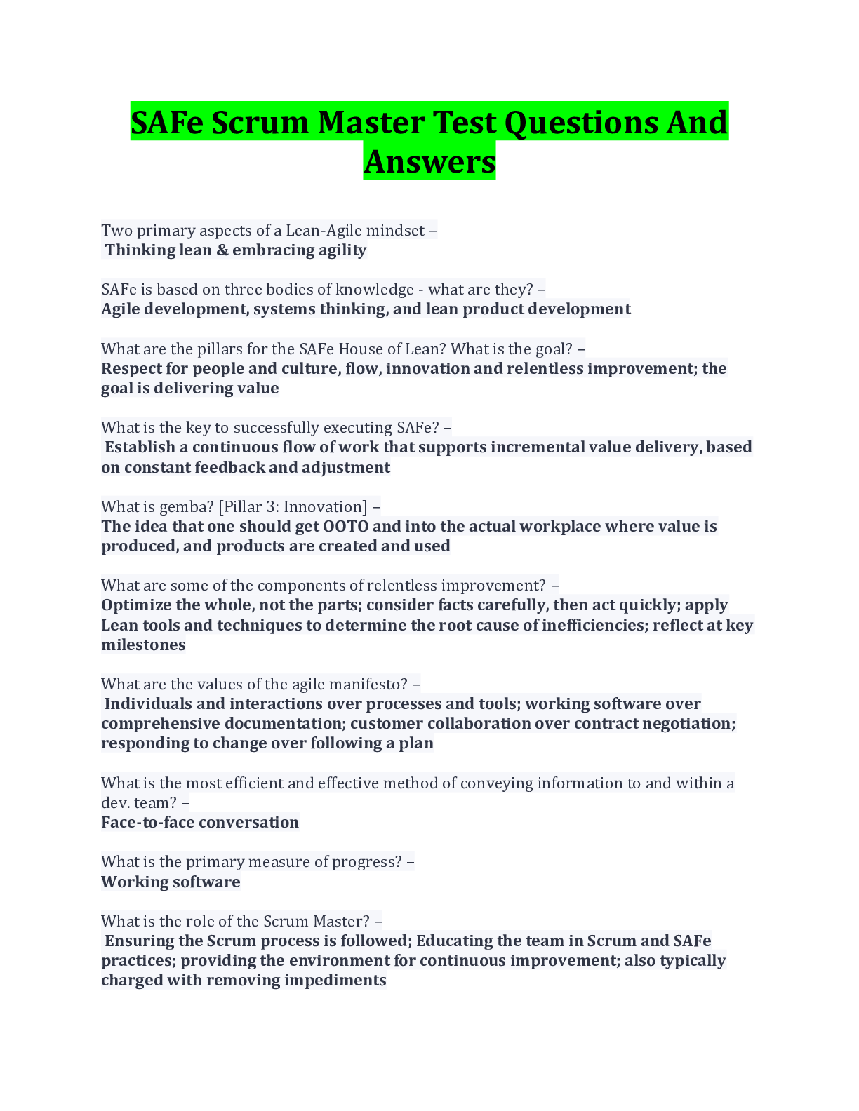 SAFe Scrum Master Test Questions And Answers Complete Solution / Download