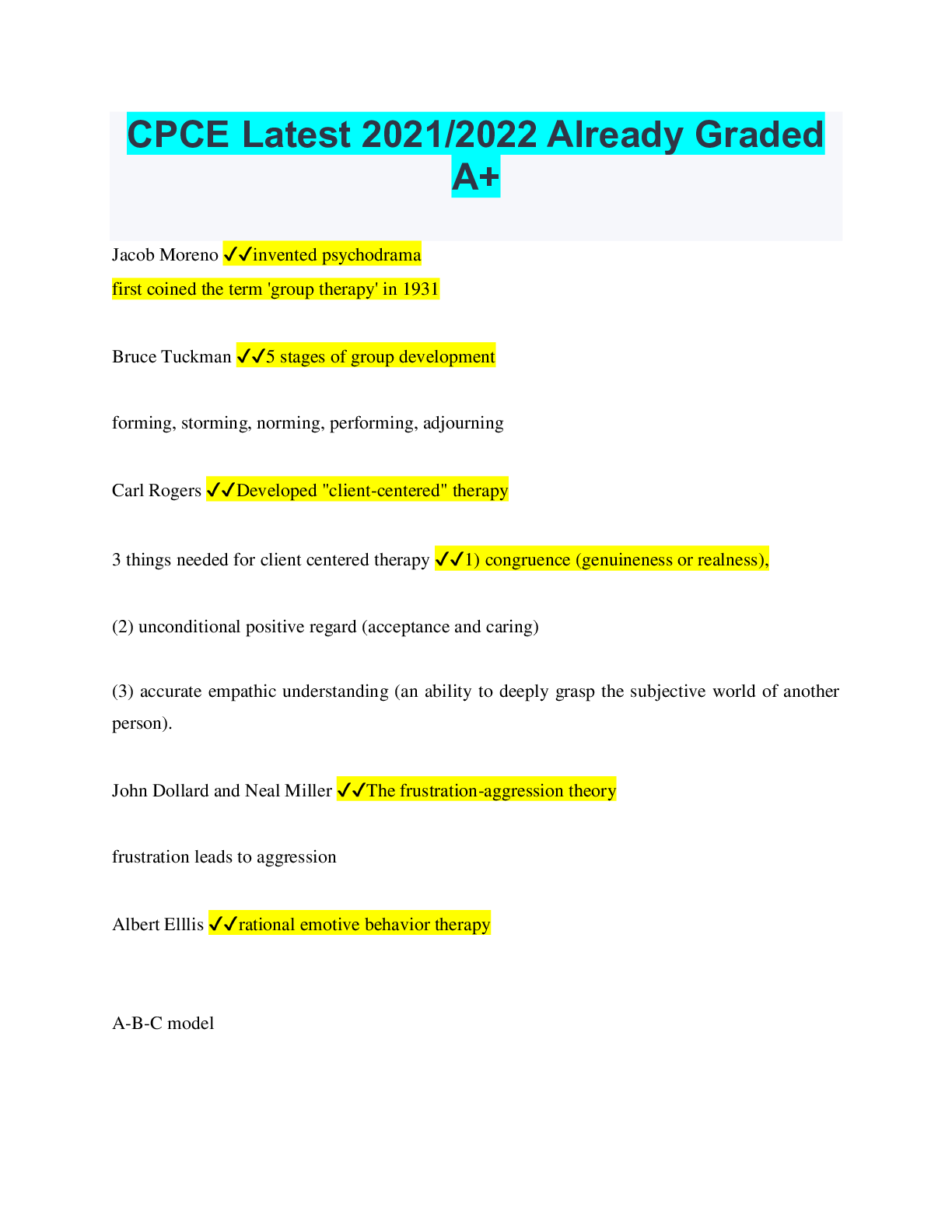 CPCE Latest 2021/2022 Already Graded A+ Jacob Moreno ✔✔invented psychodrama first coined the term 'group therapy' in 1931 Bruce Tuckman ✔✔5 stages of group development forming, storming, norming,...