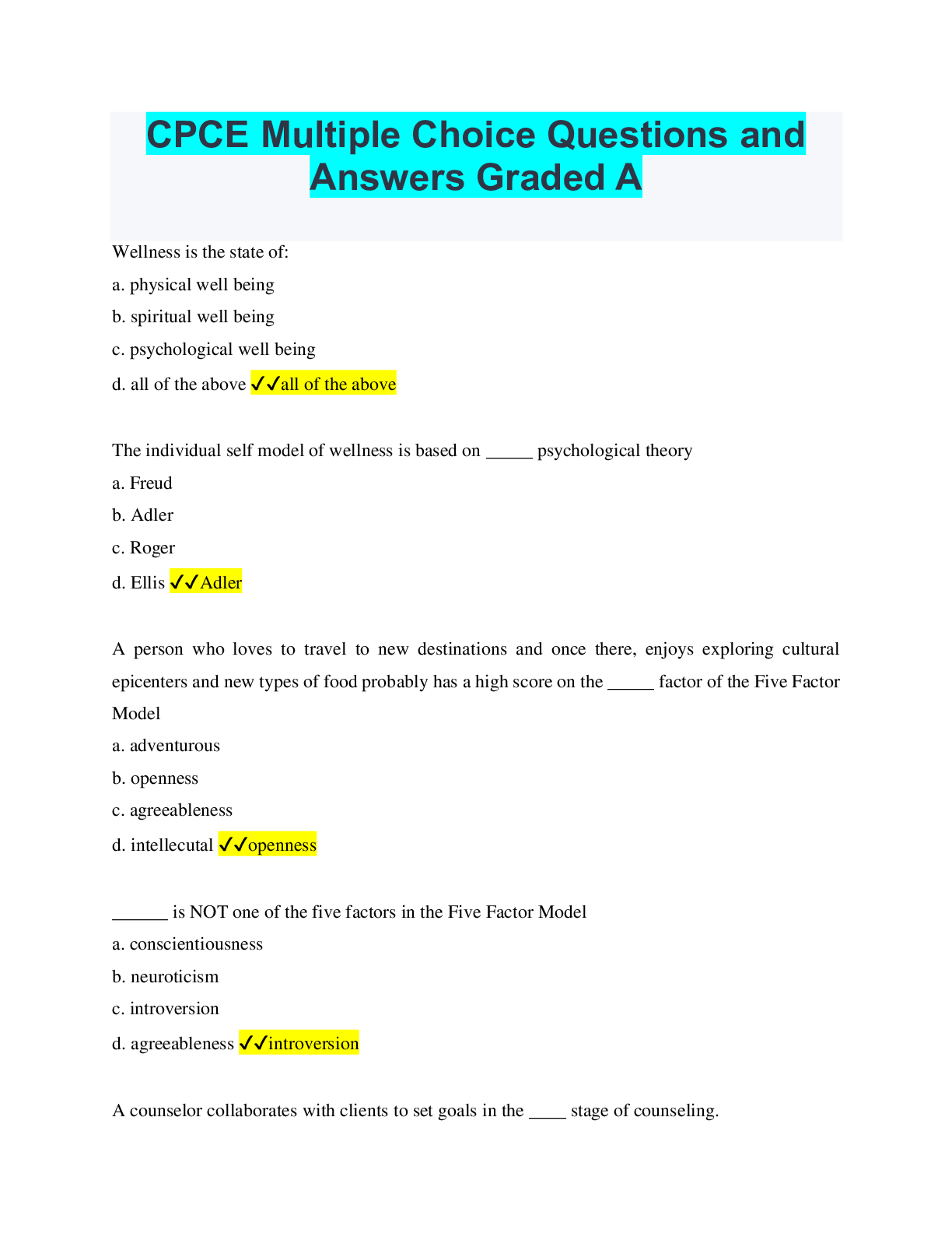 CPCE Multiple Choice Questions and Answers Graded A Wellness is the state of: a. physical well being b. spiritual well being c. psychological well being d. all of the above ✔✔all of the above T...