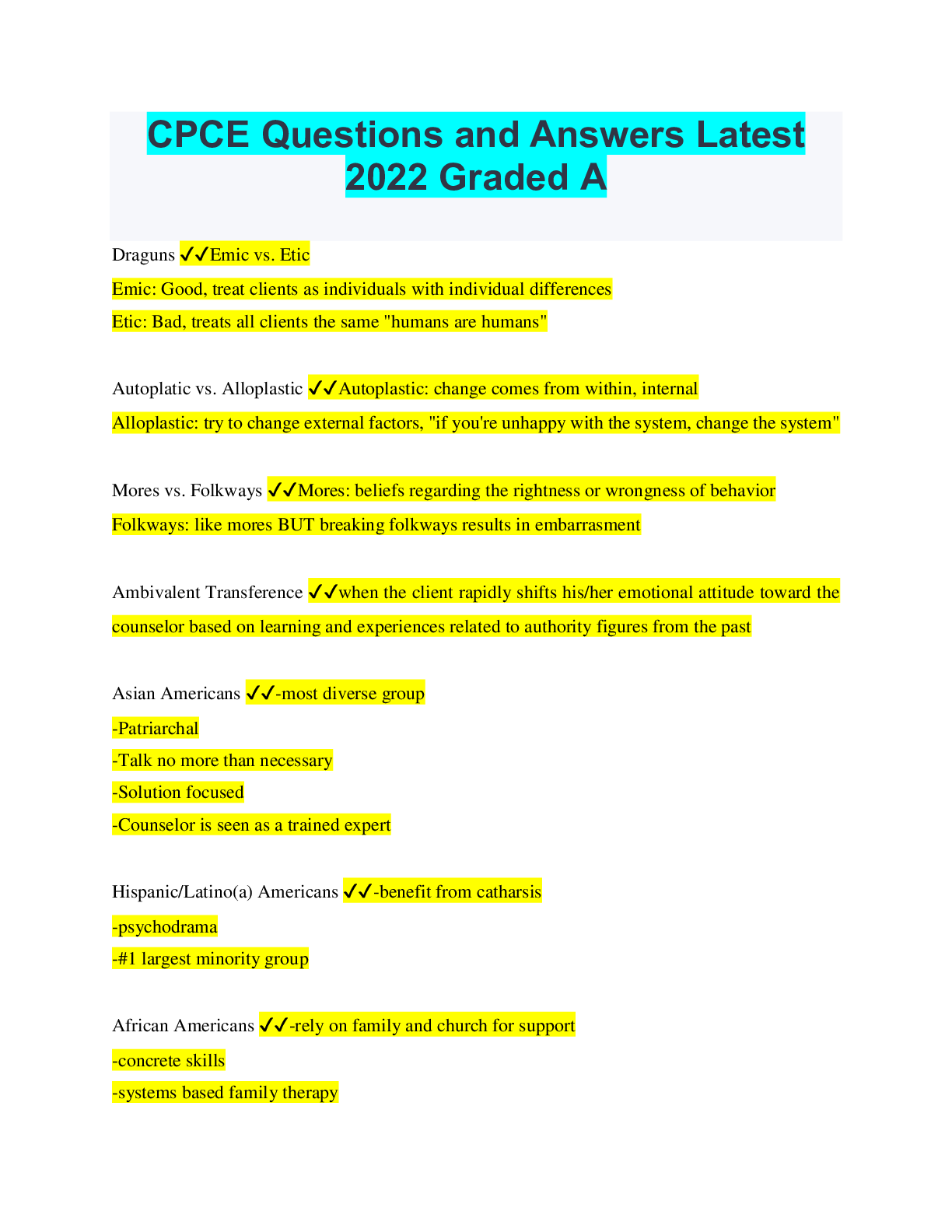 CPCE Questions and Answers Latest 2022 Graded A Draguns ✔✔Emic vs. Etic Emic: Good, treat clients as individuals with individual differences Etic: Bad, treats all clients the same "humans are huma...