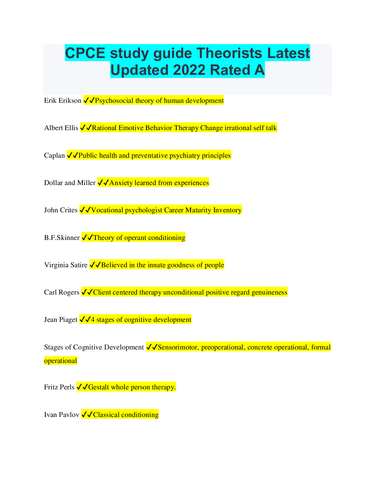 CPCE study guide Theorists Latest Updated 2022 Rated A Erik Erikson ✔✔Psychosocial theory of human development Albert Ellis ✔✔Rational Emotive Behavior Therapy Change irrational self talk Caplan ✔...