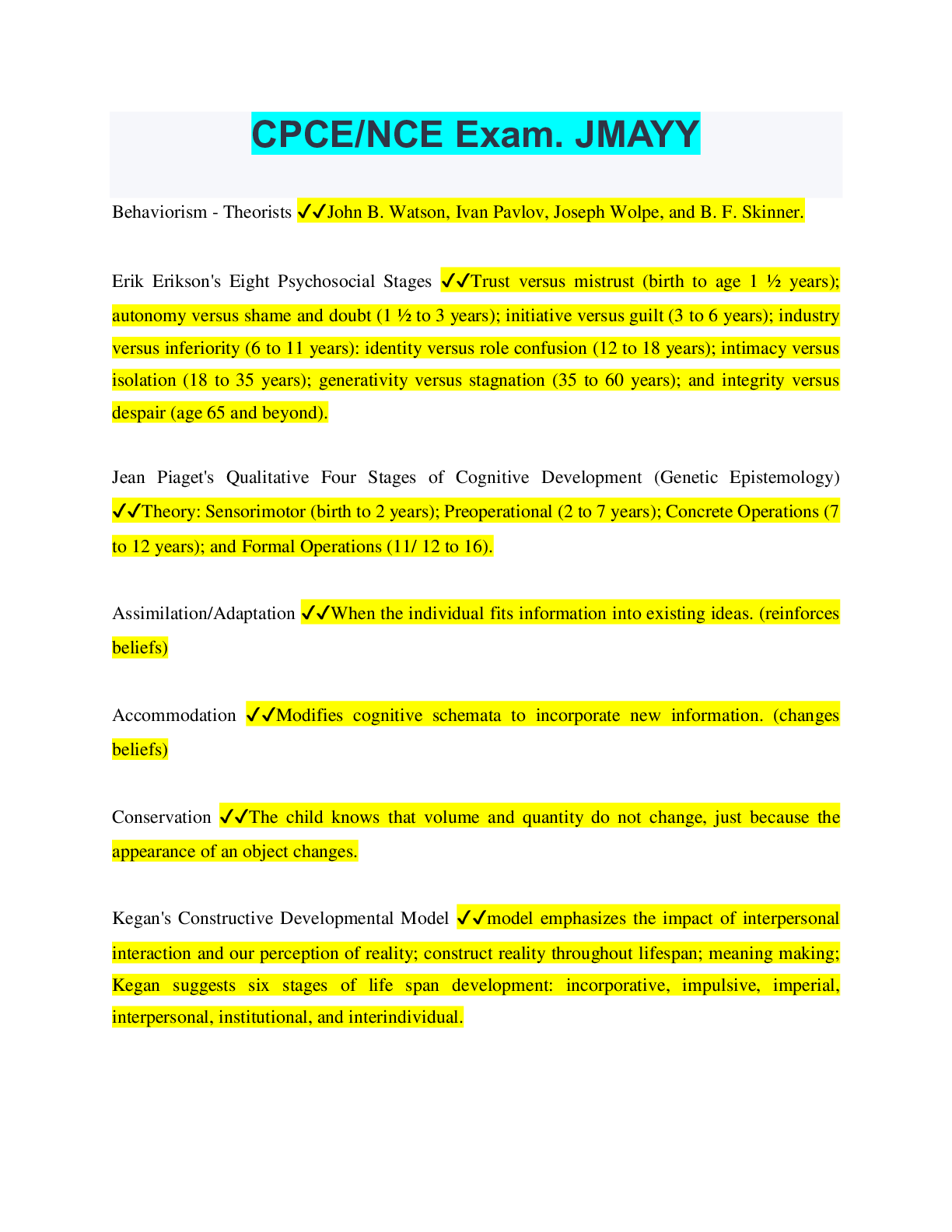 CPCE/NCE Exam. JMAYY Behaviorism - Theorists ✔✔John B. Watson, Ivan Pavlov, Joseph Wolpe, and B. F. Skinner. Erik Erikson's Eight Psychosocial Stages ✔✔Trust versus mistrust (birth to age 1 ½ years)...