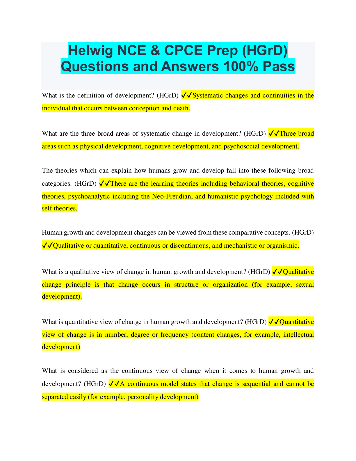 Helwig NCE & CPCE Prep (HGrD) Questions and Answers 100% Pass What is the definition of development? (HGrD) ✔✔Systematic changes and continuities in the individual that occurs between conception an...