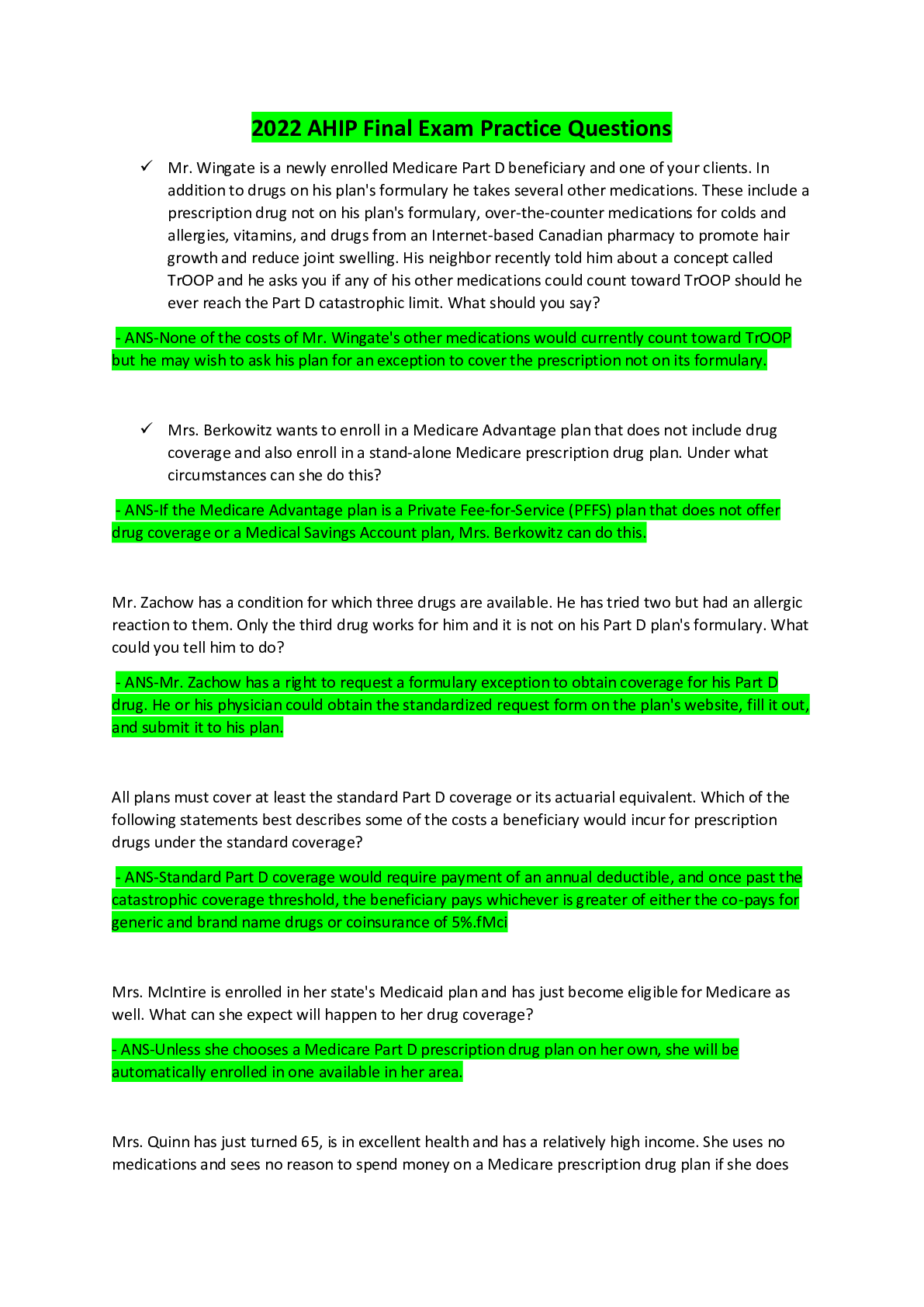2022 AHIP Final Exam Practice Questions Mr. Wingate is a newly enrolled Medicare Part D beneficiary and one of your clients. In addition to drugs on his plan's formulary he takes several other medi...