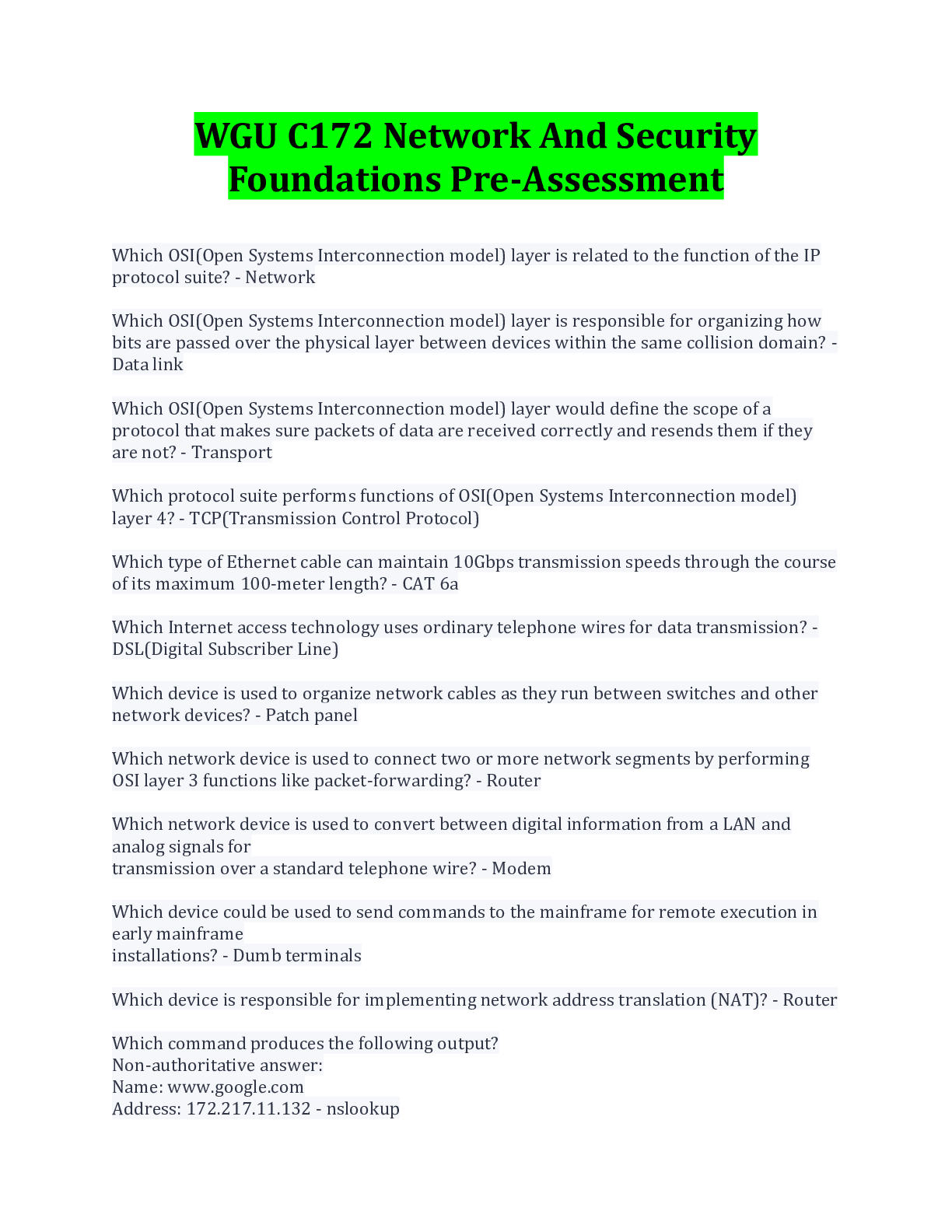 Computer Science> EXAM > WGU C172 Network And Security Foundations Pre-Assessment Questions And Answers Download To Score An A (All)