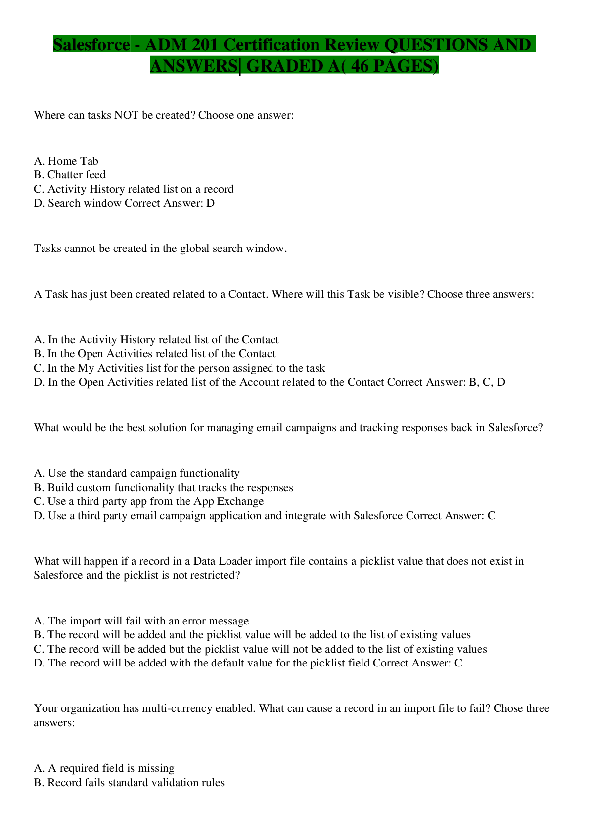 Salesforce - ADM 201 Certification Review QUESTIONS AND ANSWERS| GRADED A( 46 PAGES) Where can tasks NOT be created? Choose one answer: A. Home Tab B. Chatter feed C. Activity History related...