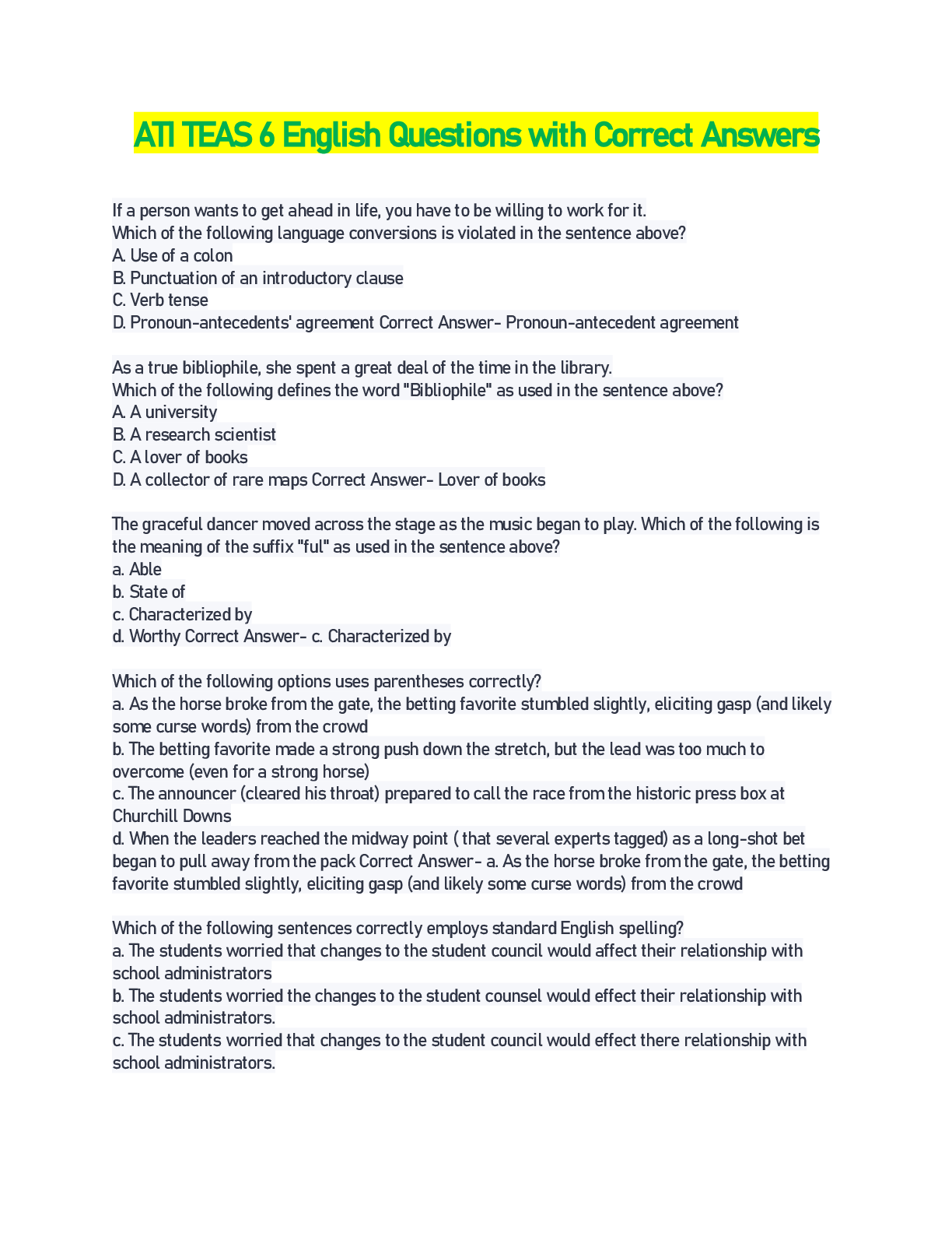 *NURSING> EXAM > ATI TEAS English grammar 2022 Questions and Answers (All)