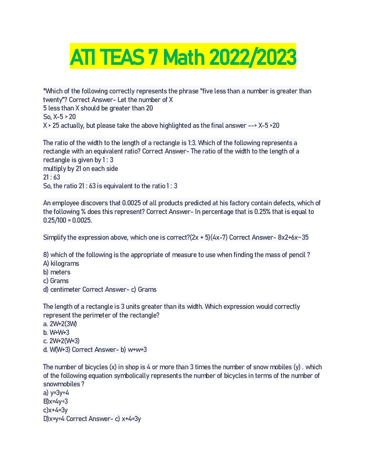 Health Care> EXAM > ATI TEAS MATH Questions with Correct Answers 2021 (All)