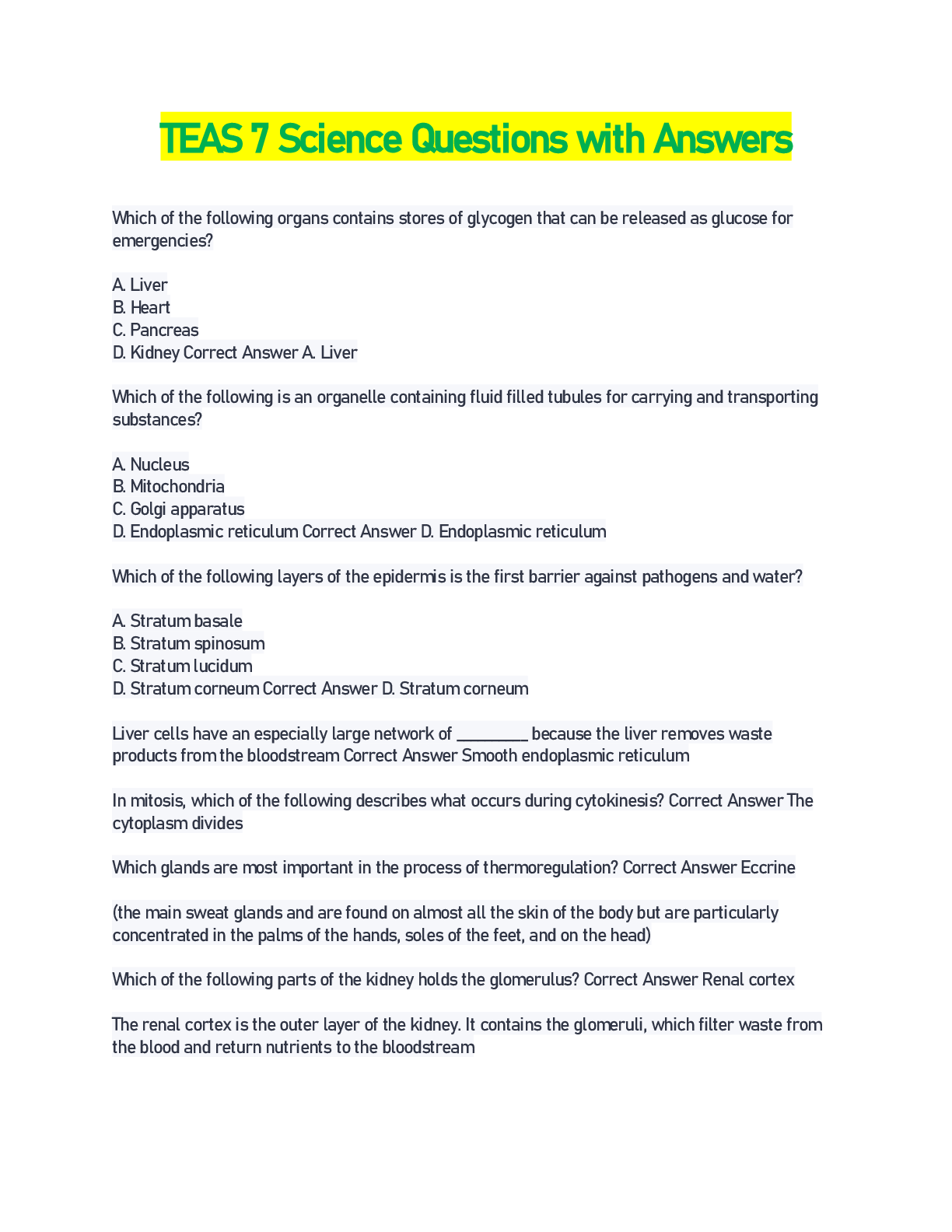 TEAS 7 Science Questions with Answers Which of the following organs contains stores of glycogen that can be released as glucose for emergencies? A. Liver B. Heart C. Pancreas D. Kidney Correct...