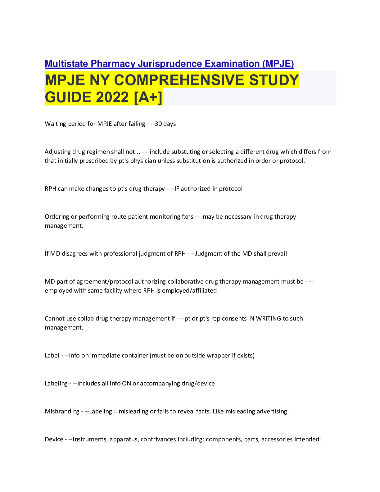 Law> EXAM > Multistate Pharmacy Jurisprudence Examination (MPJE) MPJE NY COMPREHENSIVE STUDY GUIDE 2022 [A+] (All)