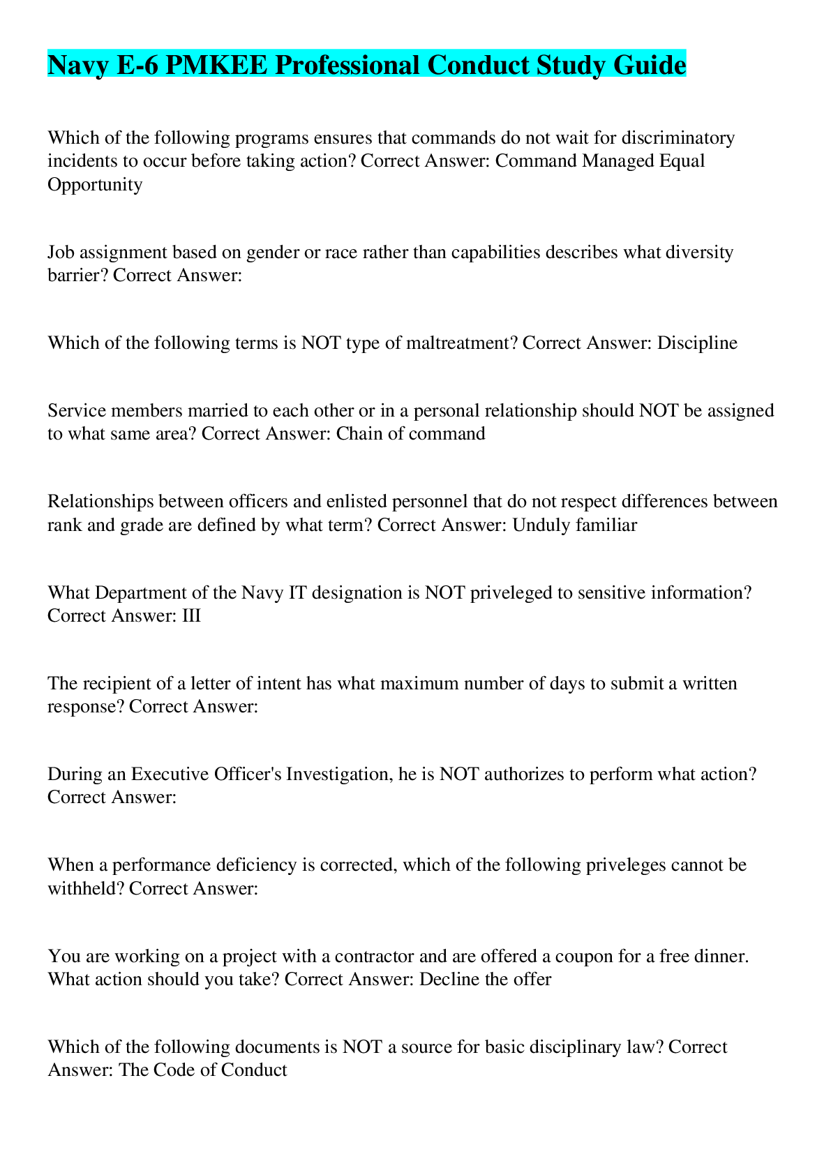 Navy E-6 PMKEE Professional Conduct Study Guide QUESTIONS AND ANSWERS| (112 QUESTIONS) 10 PAGES