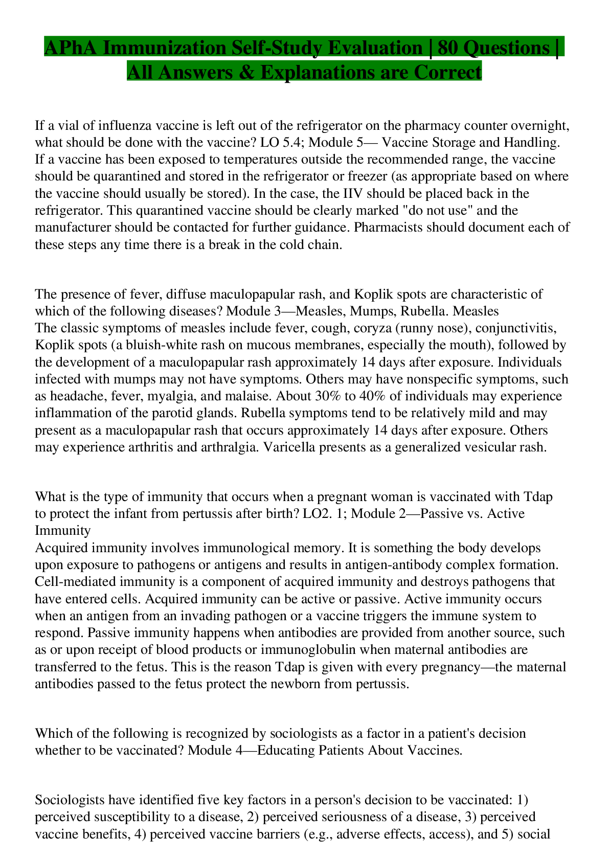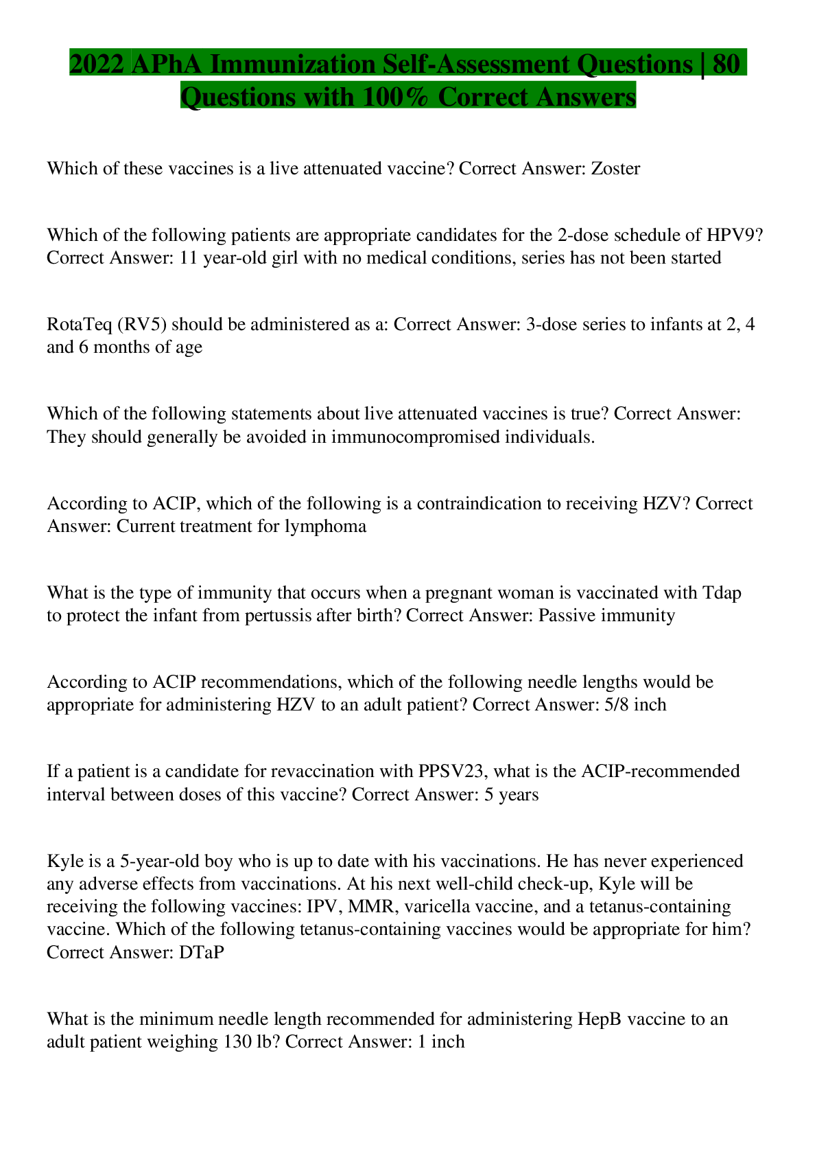 Health Care> EXAM > APhA Immunization Self-Study Exam | 80 Questions with 100% Correct Answers (All)