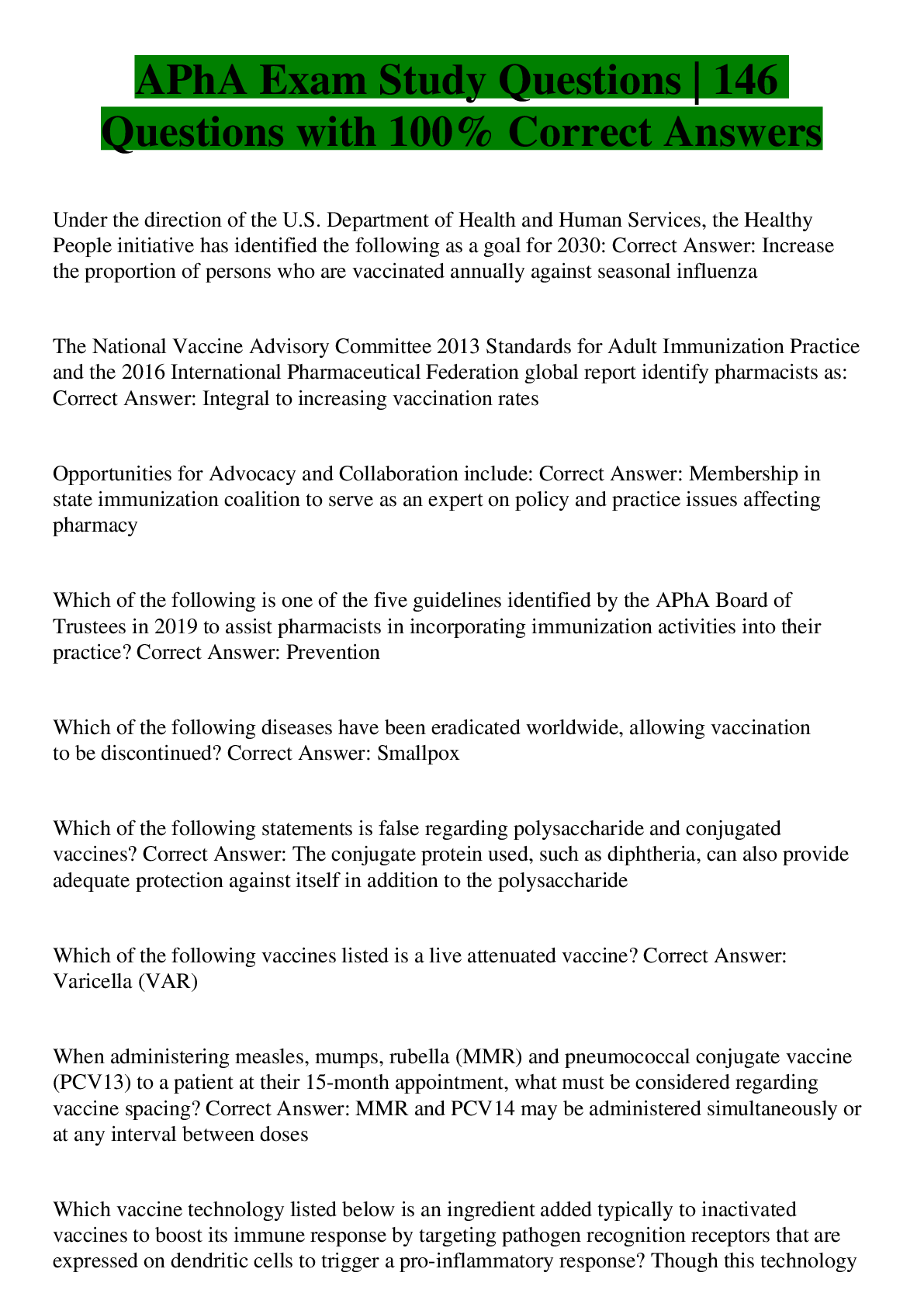 Health Care> EXAM > APhA Immunization Exam | 100 Questions with 100% Correct Answers (All)