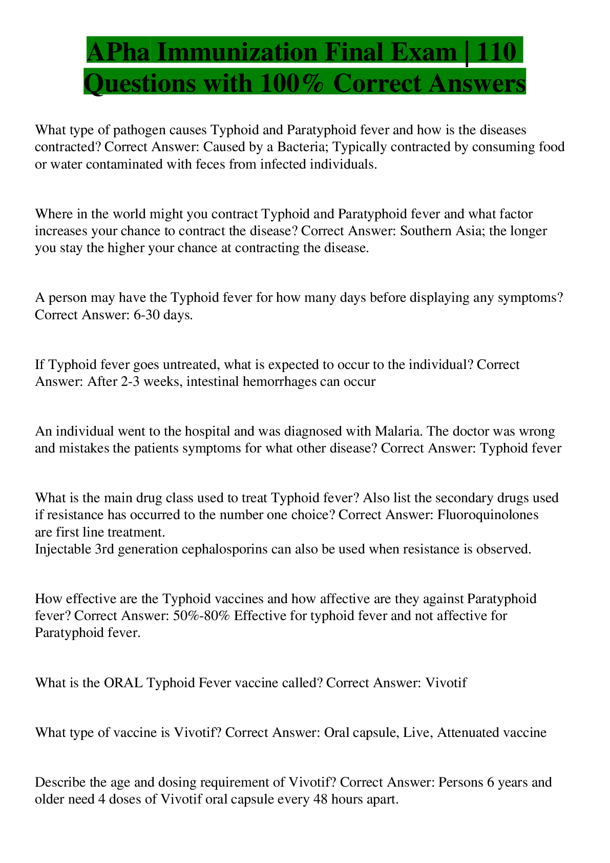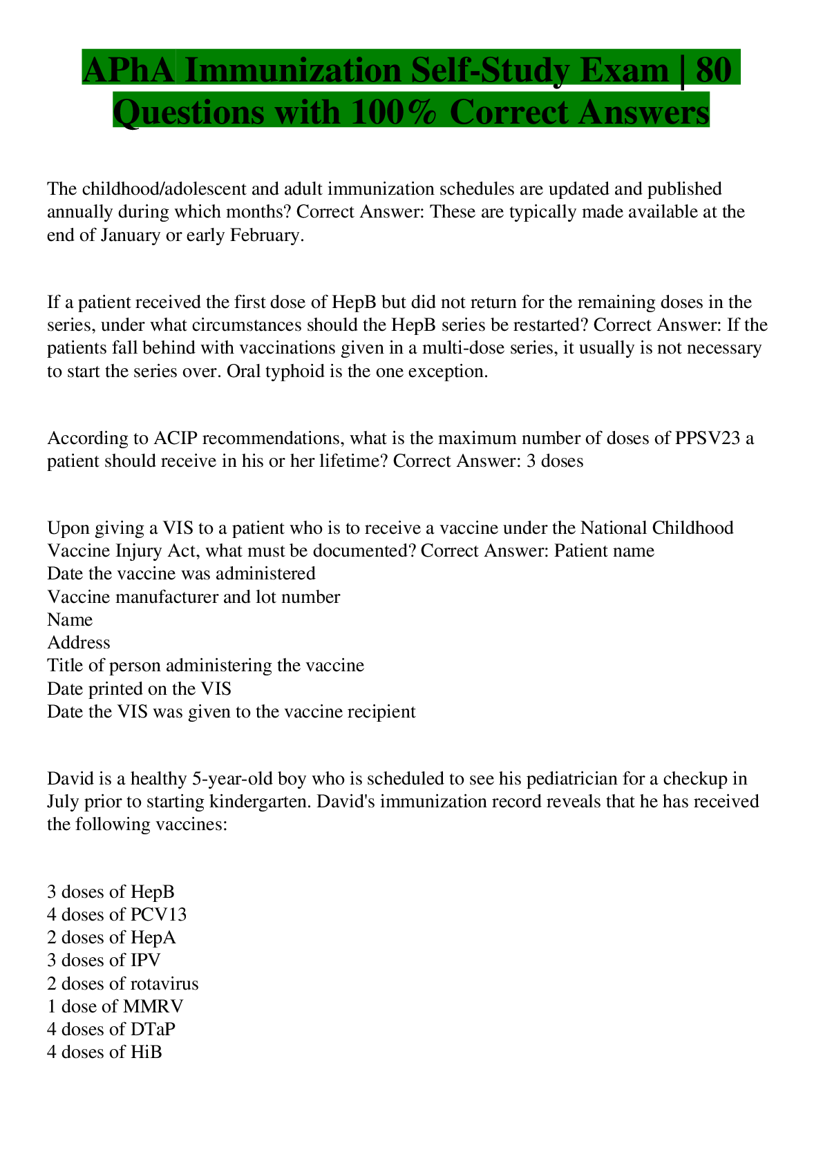 Health Care> EXAM > Immunization exam -APHA, Immunization bs, Immunization exam1, Immunization Exam | 345 Questions with 100% Correct Answers (All)