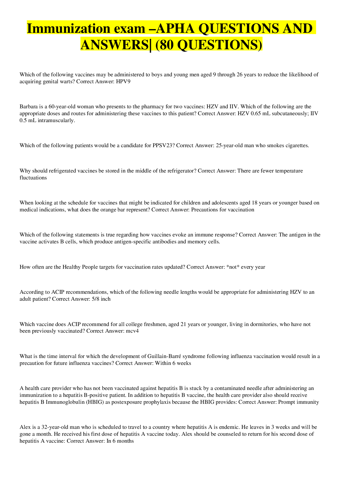 Health Care> EXAM > Immunization exam –APHA QUESTIONS AND ANSWERS| (80 QUESTIONS) (All)