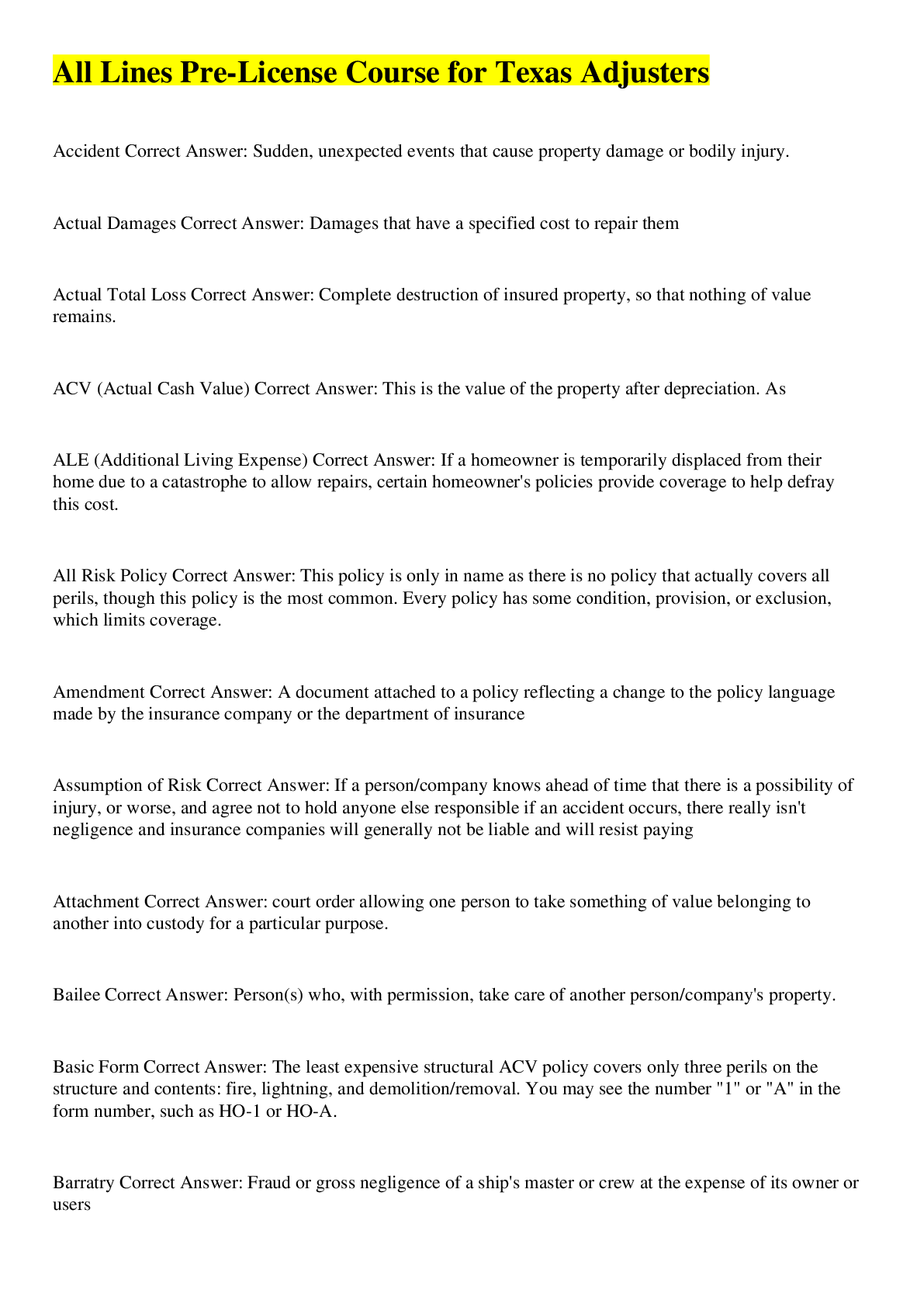 Business> EXAM > Adjuster Pro - Florida Certified Adjuster Glossary| 260 QUESTIONS| 19 PAGES (All)