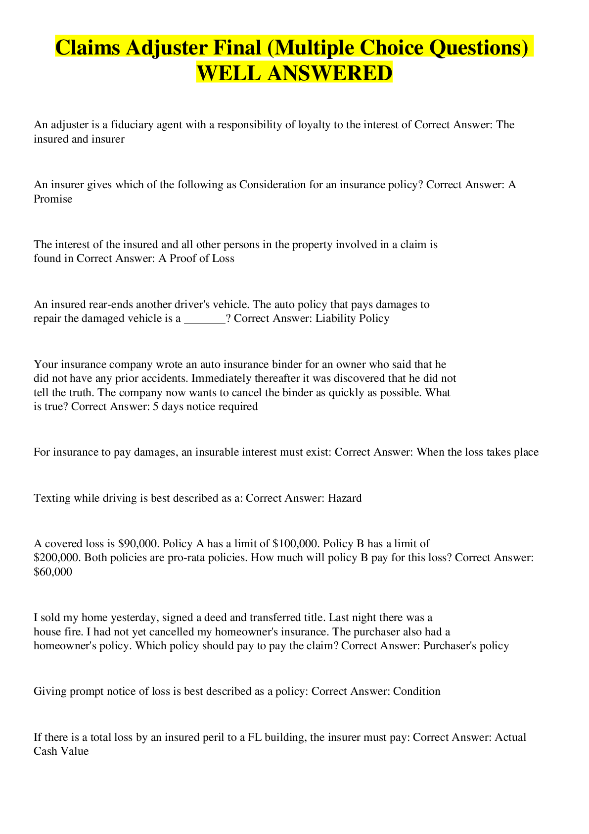 Business> EXAM > Claims Adjuster Final (Multiple Choice Questions) WELL ANSWERED (All)