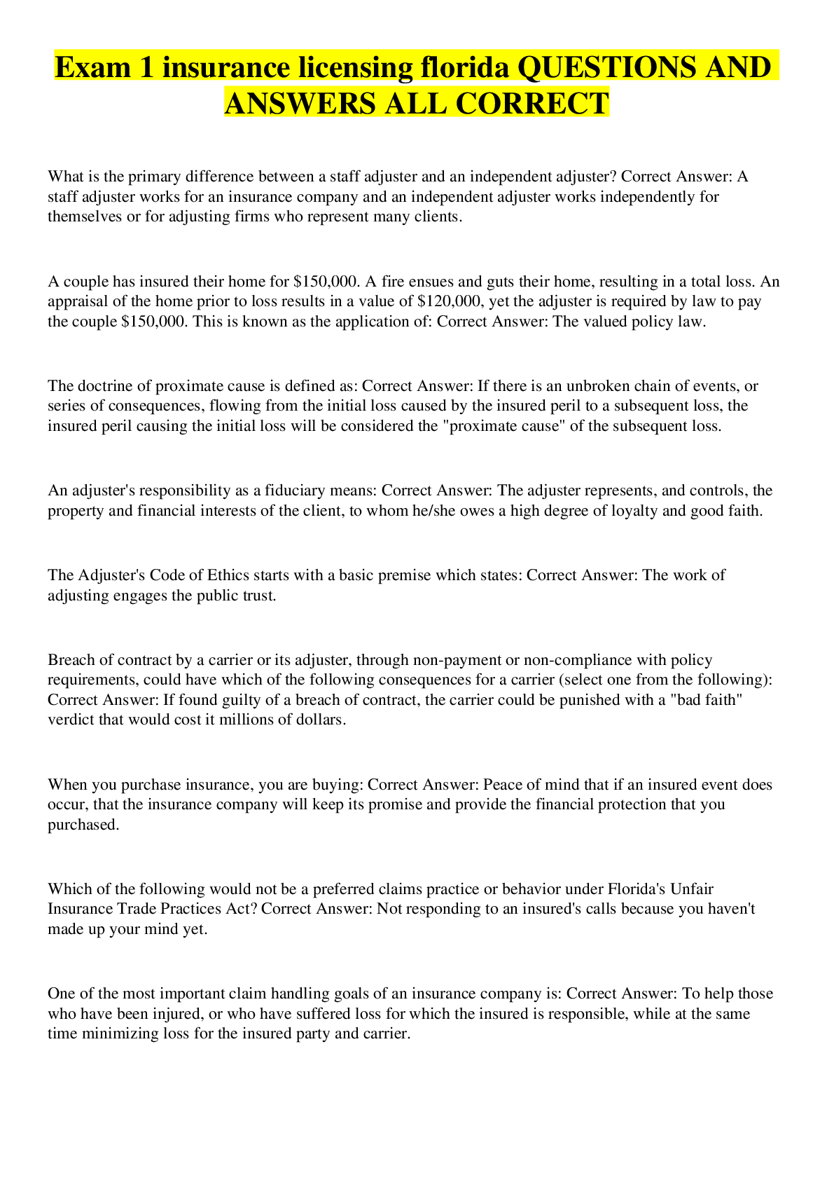 Business> EXAM > FL All Lines Claims Adjuster QUESTIONS AND ANSWERS RATED A (All)