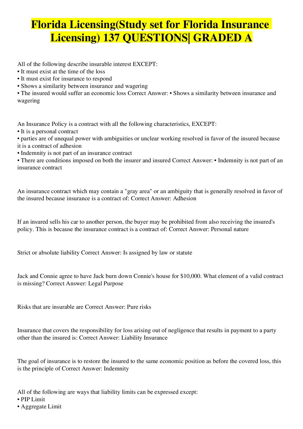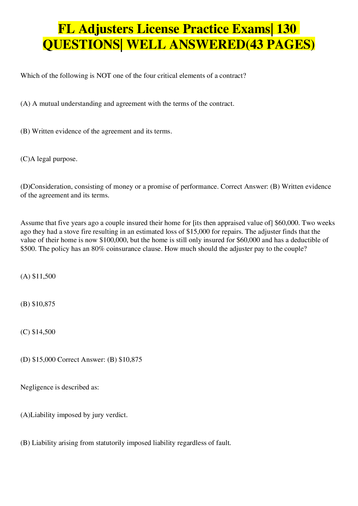 Business> EXAM > FL Adjusters License Practice Exams| 130 QUESTIONS| WELL ANSWERED(43 PAGES) (All)