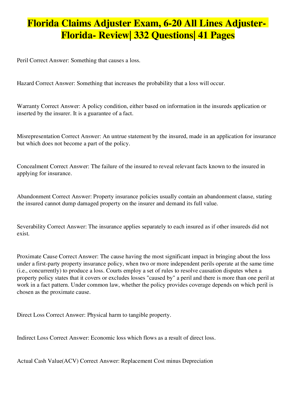Business> EXAM > Florida Test Study Guide - Public Adjusting 3-20 (Set 1)| 92 QUESTIONS| 8 PAGES (All)