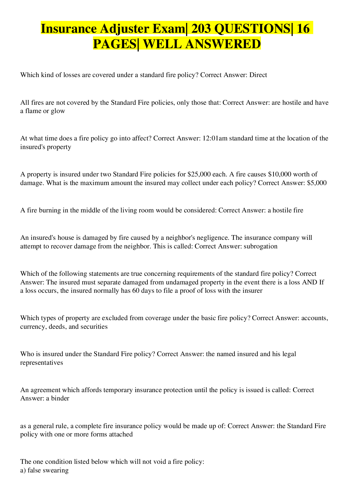 Business> EXAM > Insurance Adjuster Exam| 203 QUESTIONS| 16 PAGES| WELL ANSWERED (All)