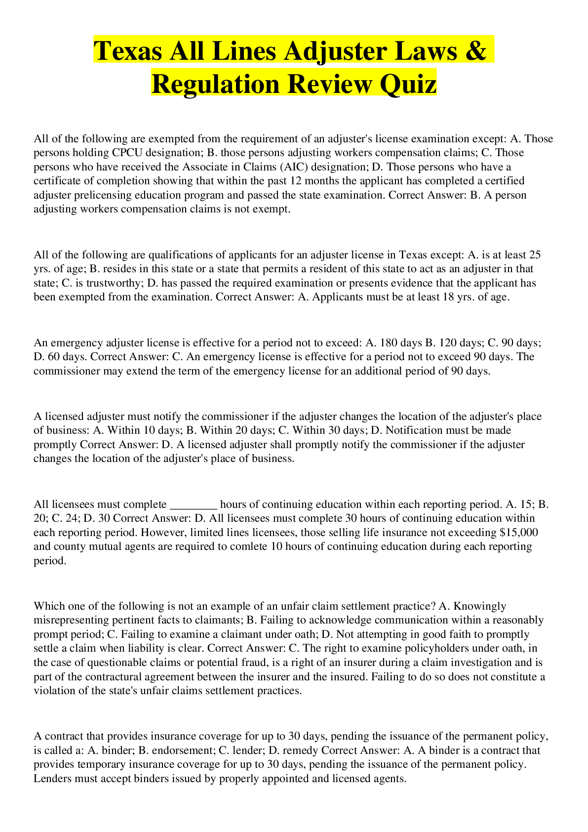 Business> EXAM > TX ADJUSTER TEST | 111 Questions with 100% Correct Answers (All)