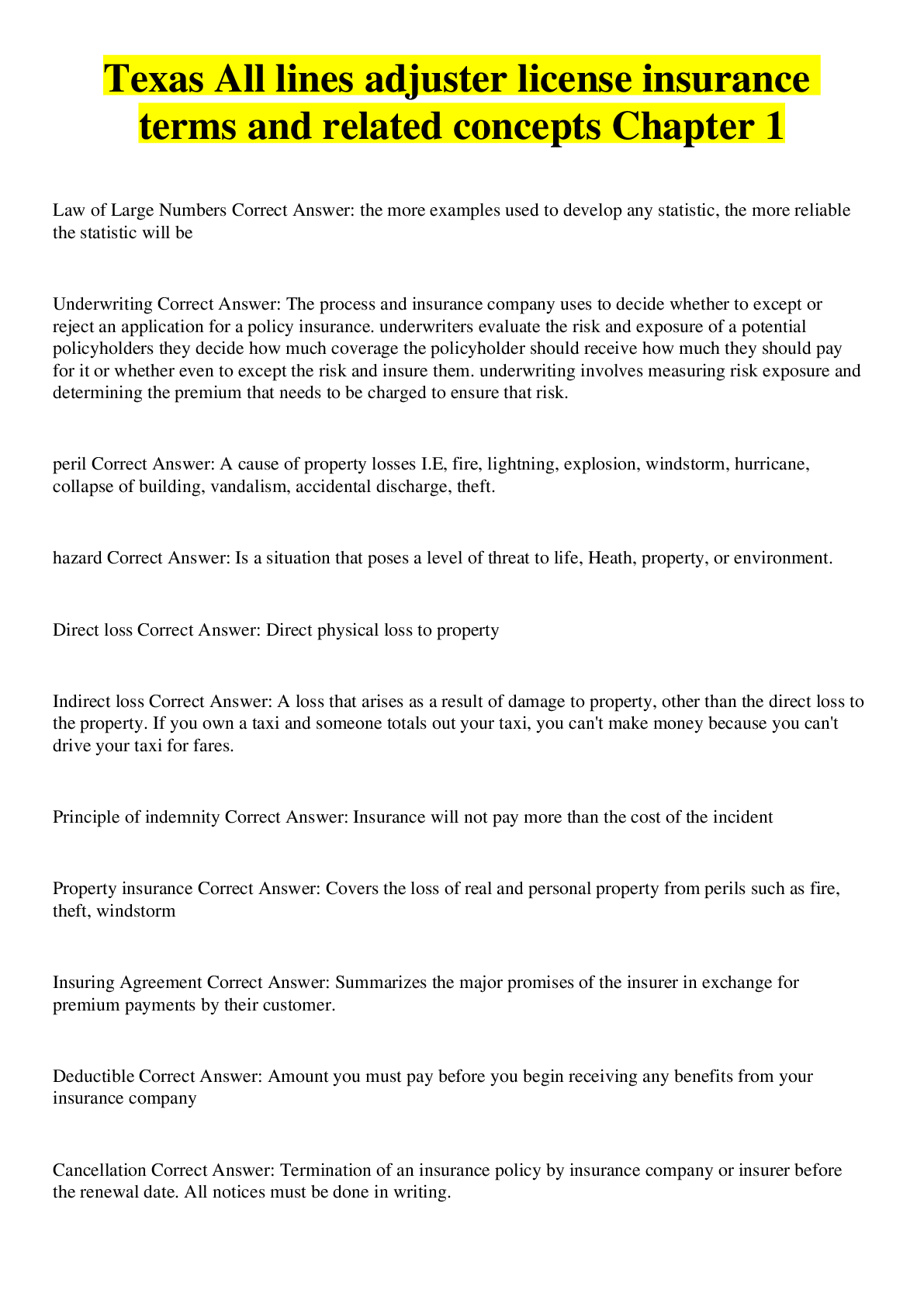 Business> EXAM > Texas All lines adjuster license insurance terms and related concepts Chapter 1 (All)