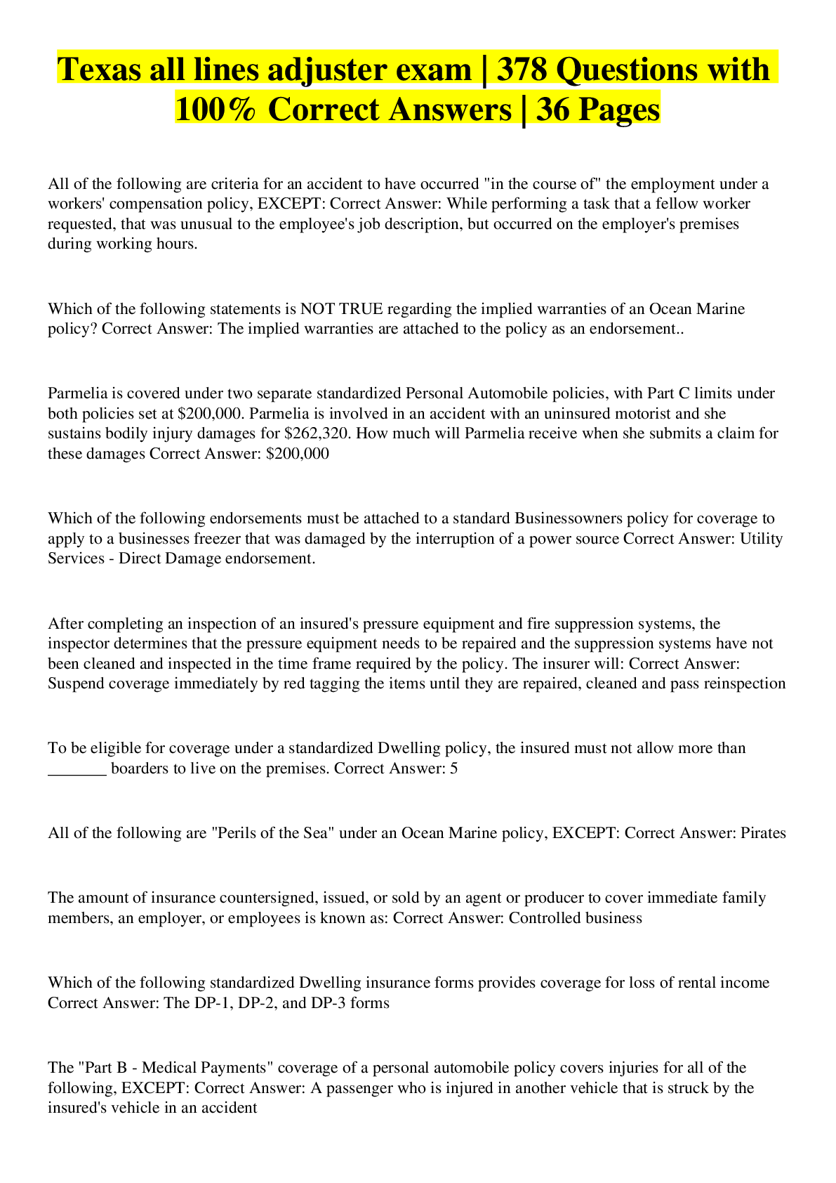 Business> EXAM > Texas all lines adjuster exam | 378 Questions with 100% Correct Answers | 36 Pages (All)