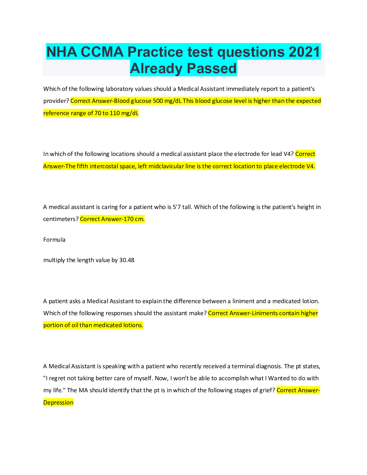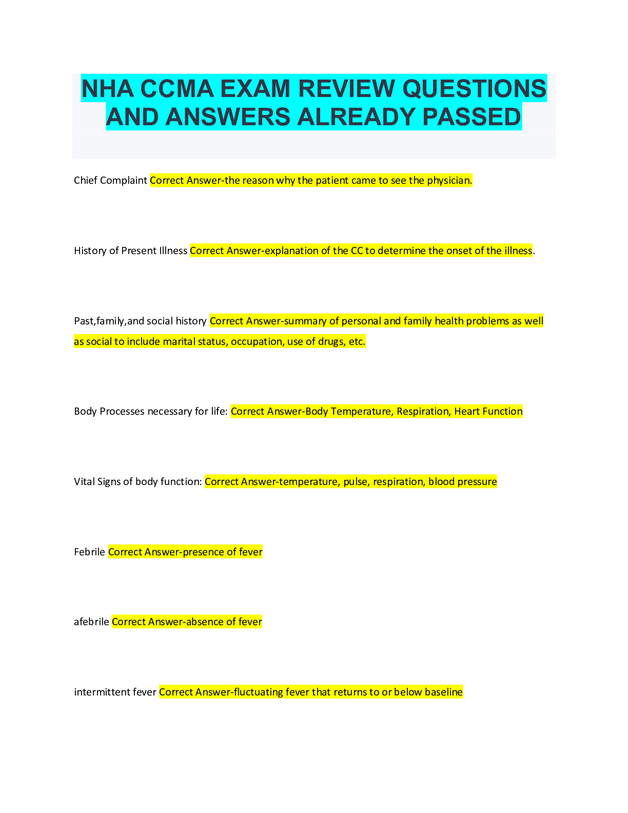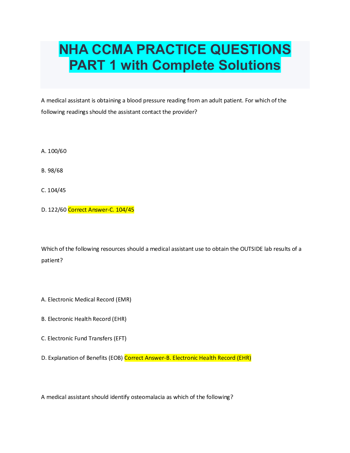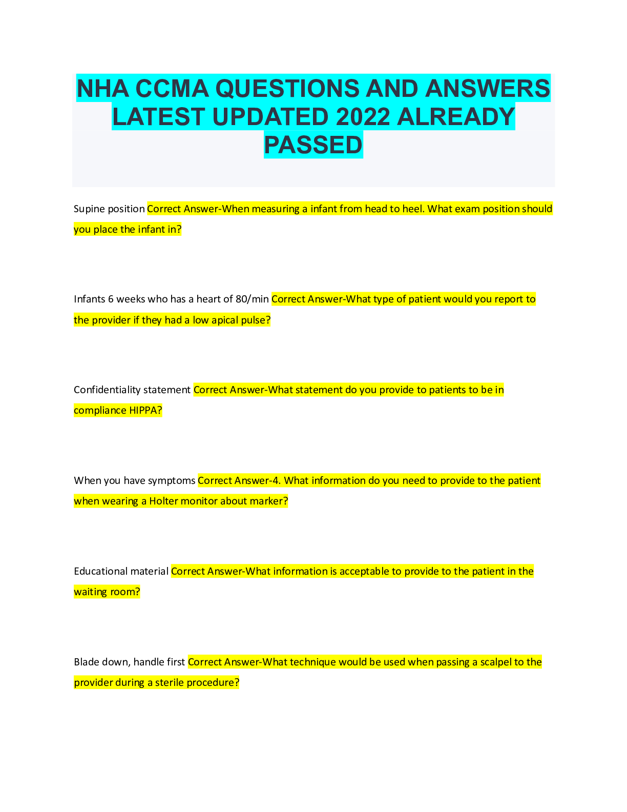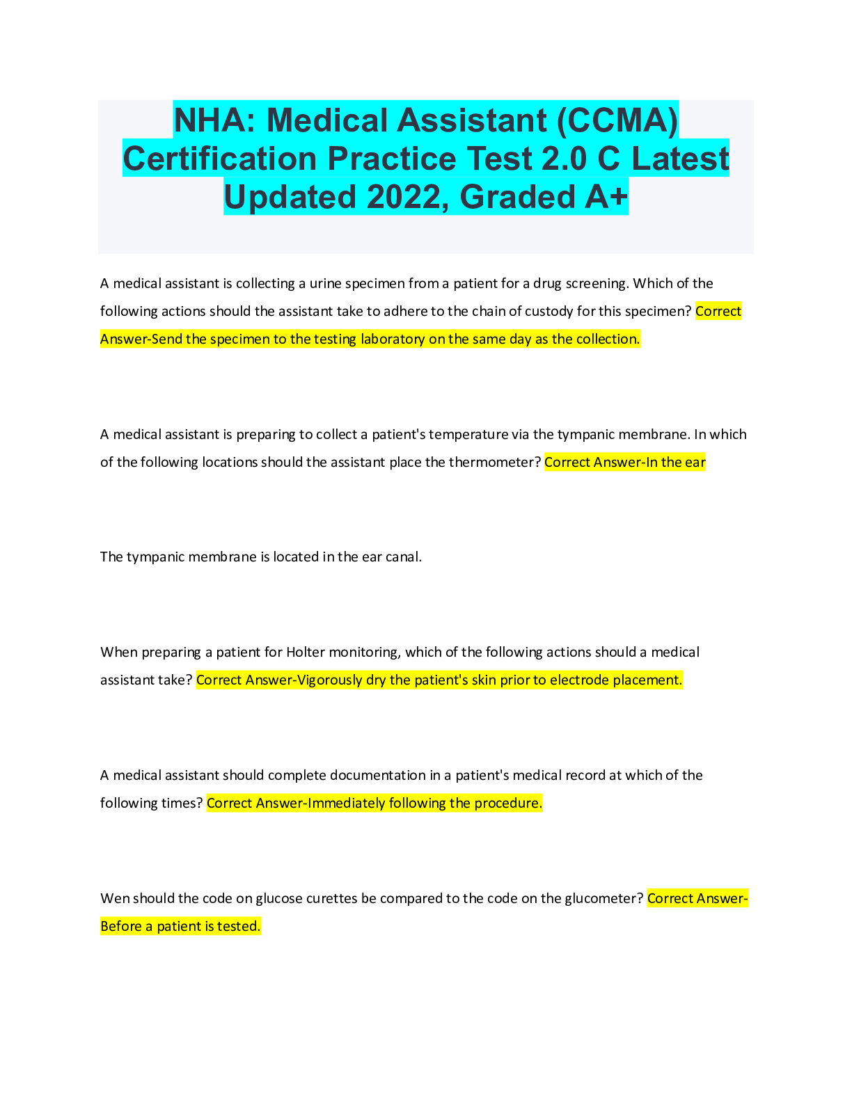 Medical Studies> EXAM > NHA CCMA Practice Exam 2020 Already Passed (All)