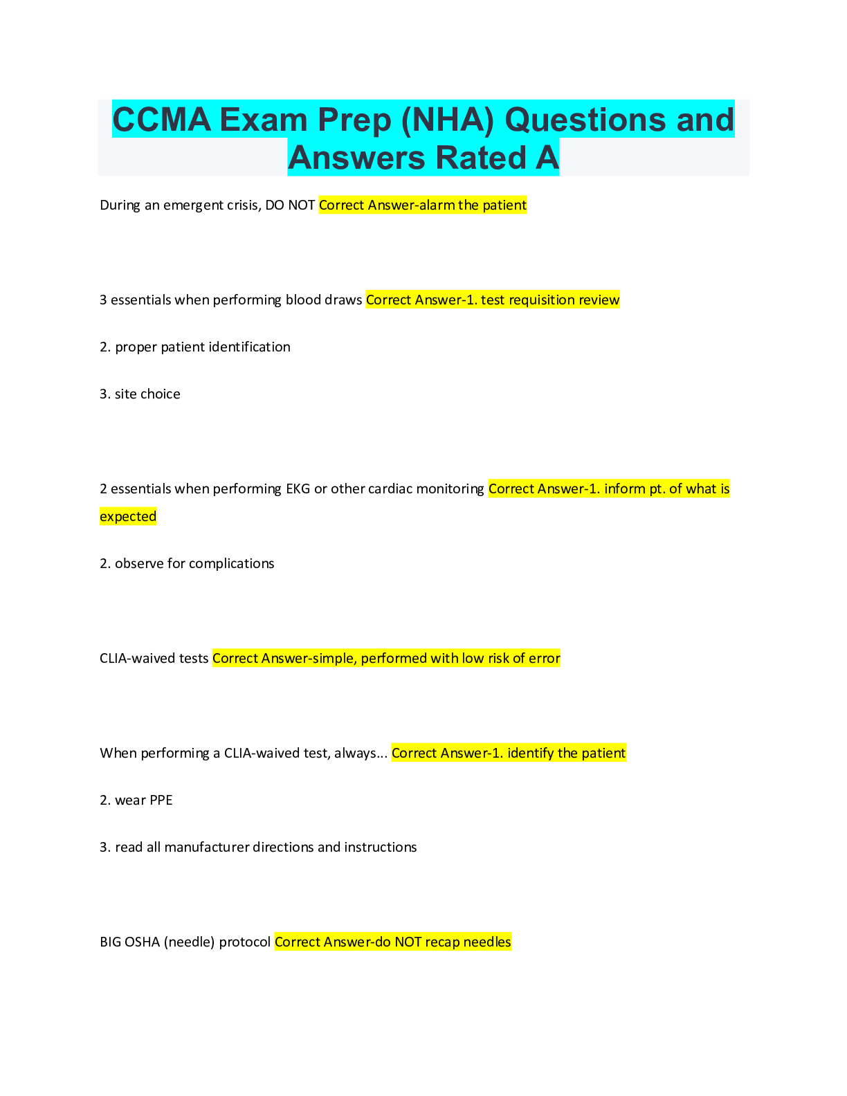 Medical Studies> EXAM > CCMA Exam Prep (NHA) Questions and Answers Rated A (All)