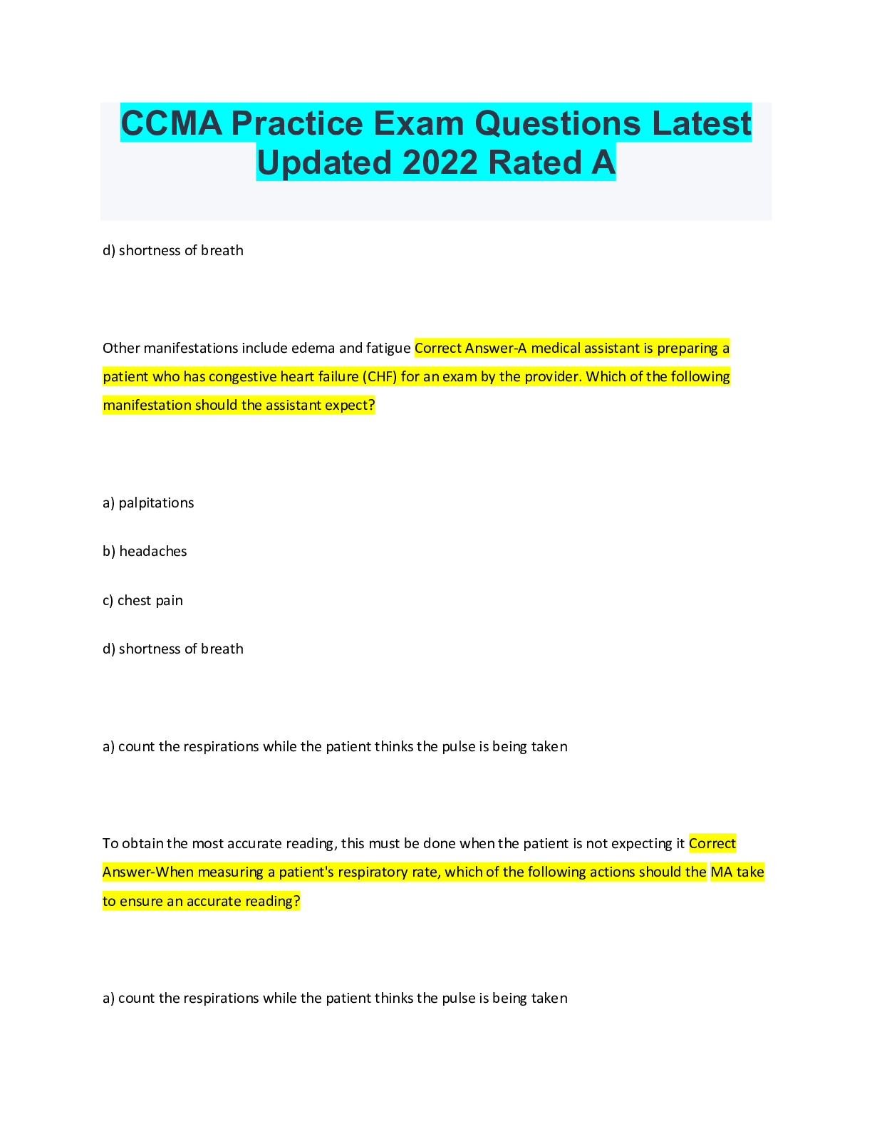 d) shortness of breath Other manifestations include edema and fatigue Correct Answer-A medical assistant is preparing a patient who has congestive heart failure (CHF) for an exam by the provider. Wh...