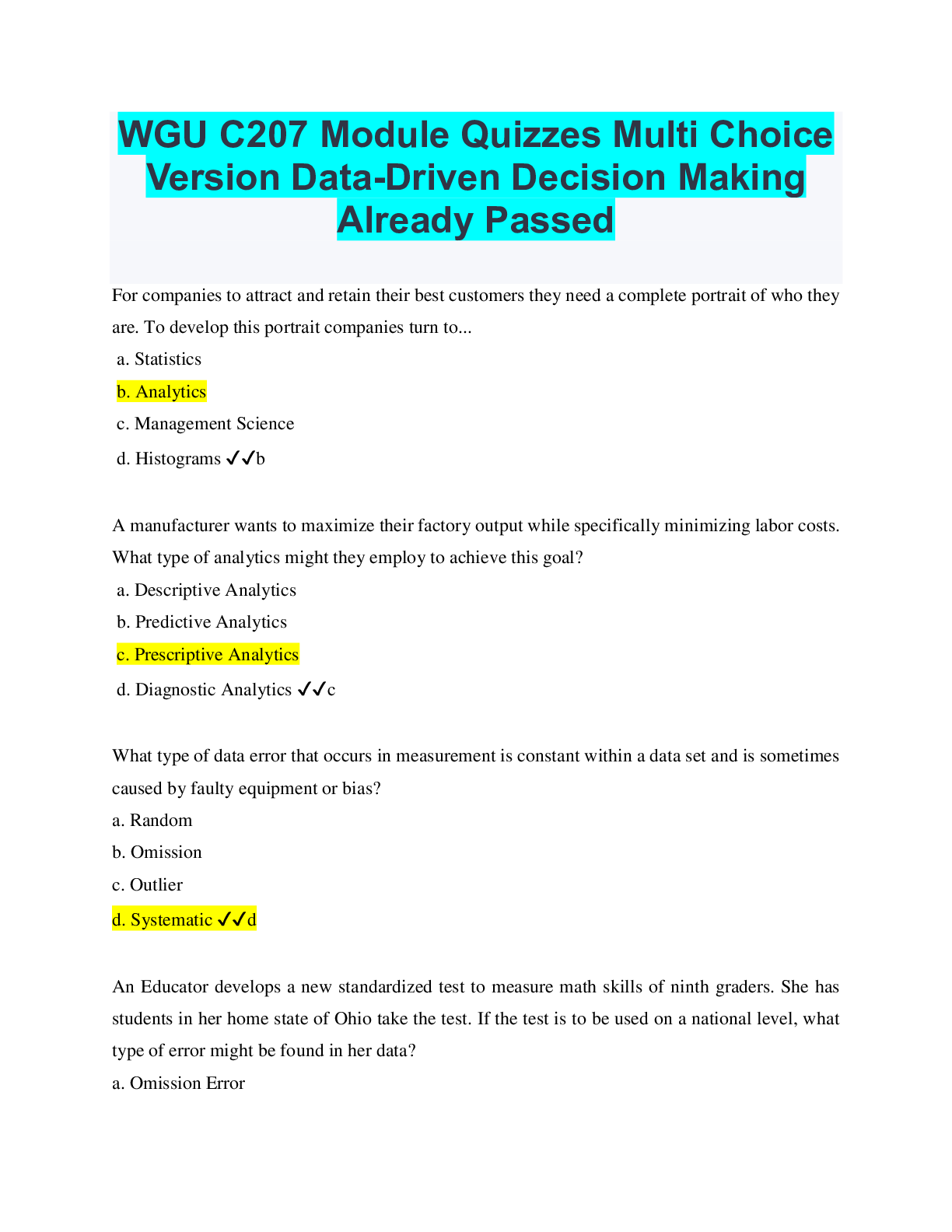Management> EXAM > WGU C207 Module Quizzes Multi Choice Version Data-Driven Decision Making Already Passed (All)