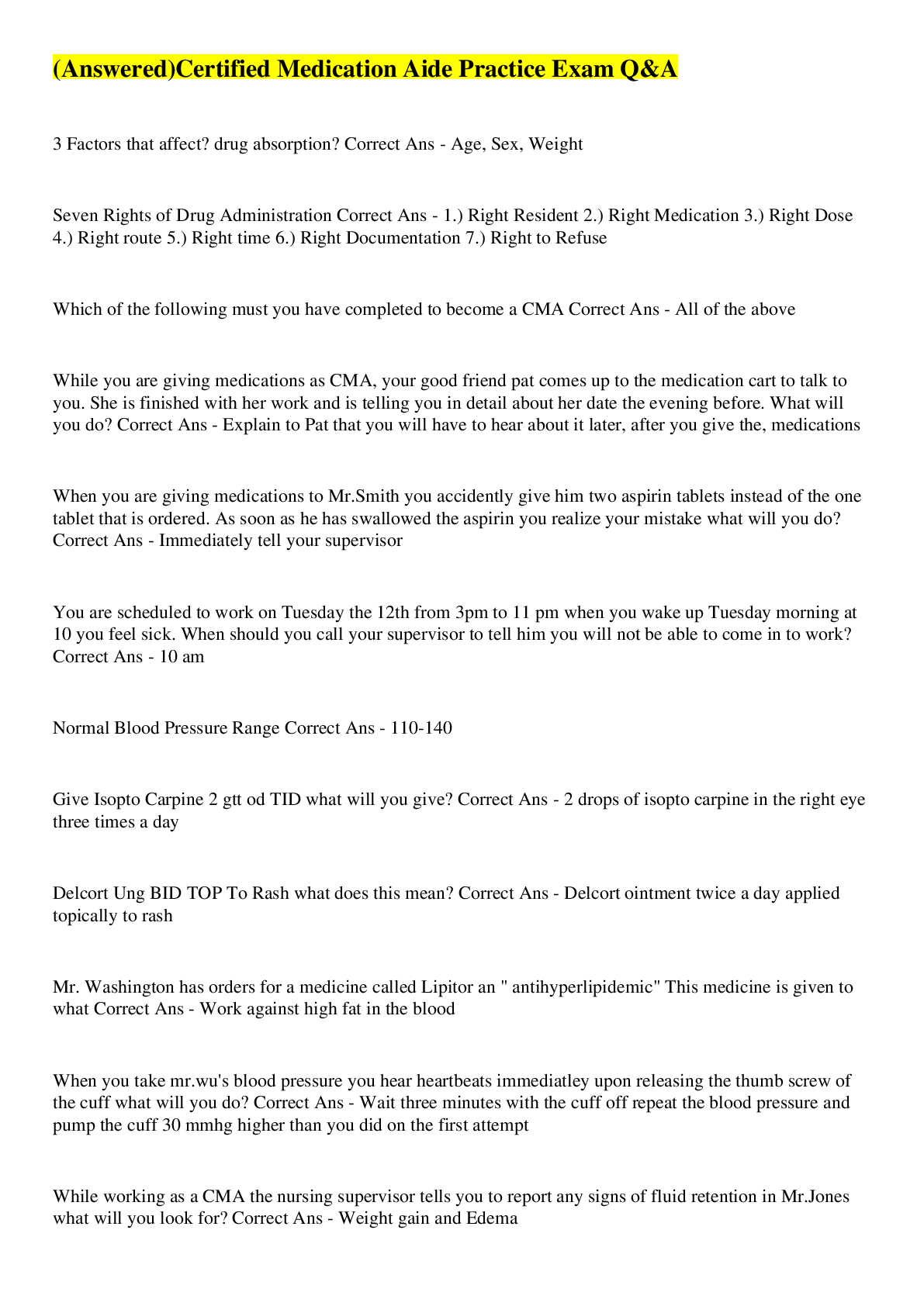 Health Care> EXAM > (Answered)Certified Medication Aide Practice Exam Q&A (All)