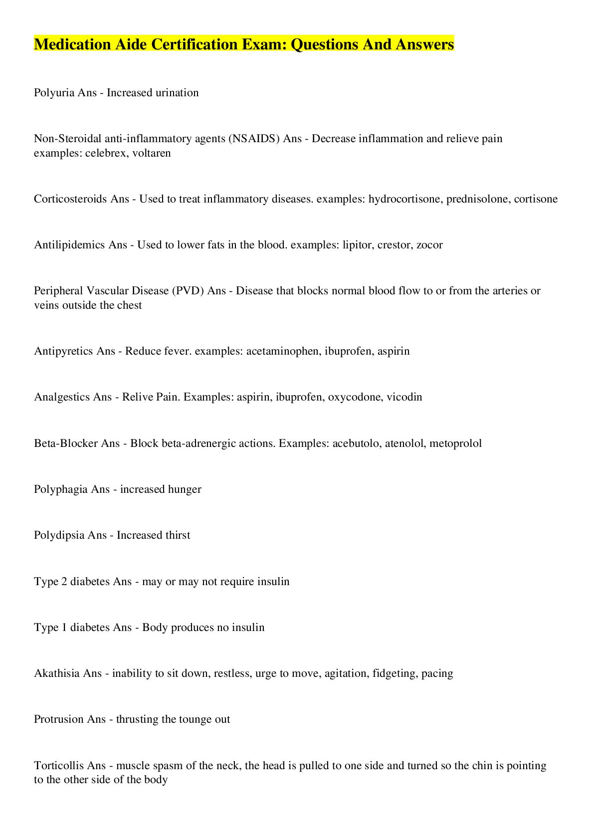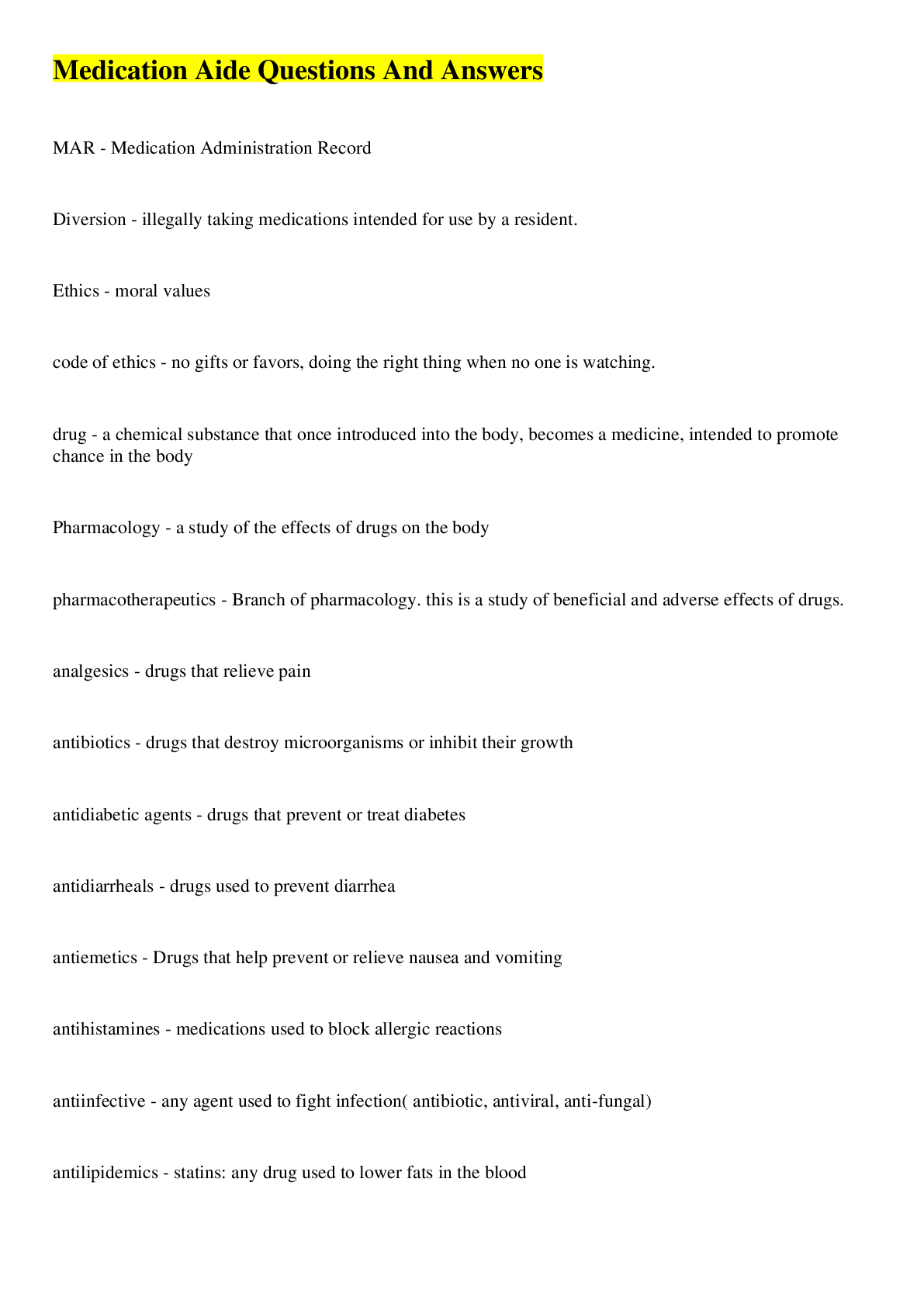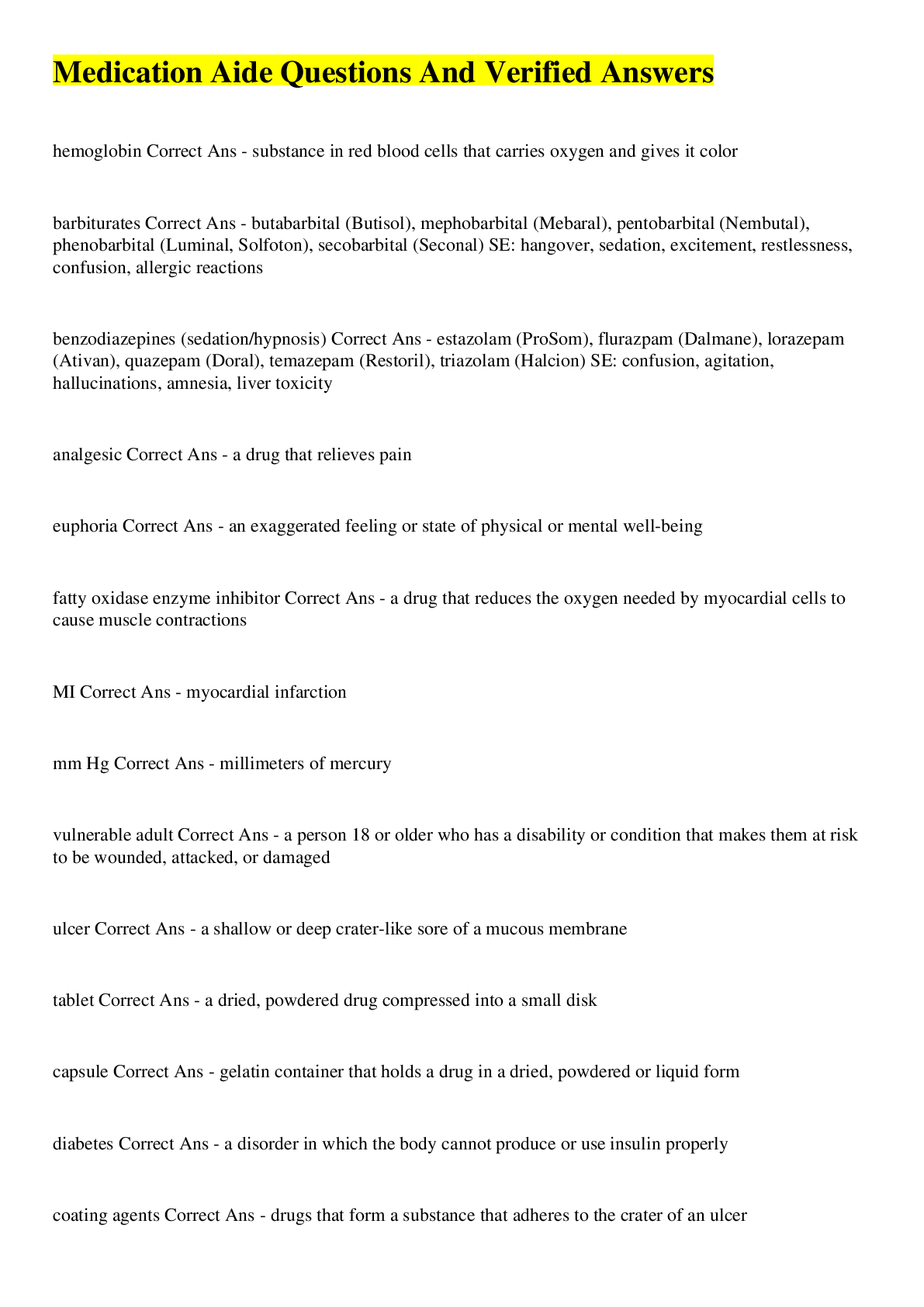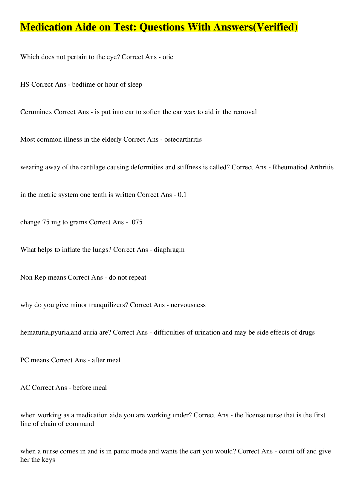 Health Care> EXAM > Medication Aide Questions And Verified Answers (All)